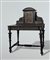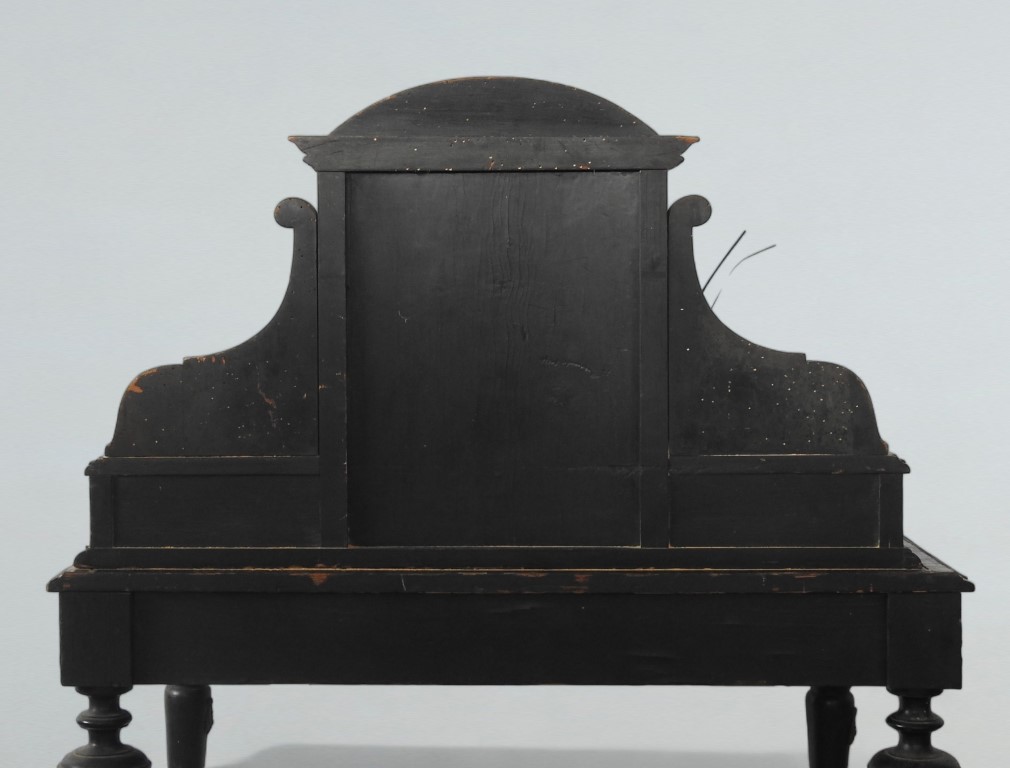 piano rettangolare con alzata a scarabattolo con uno sportello e due cassettini, un cassetto nella fascia, gambe tornite riunite da crociera