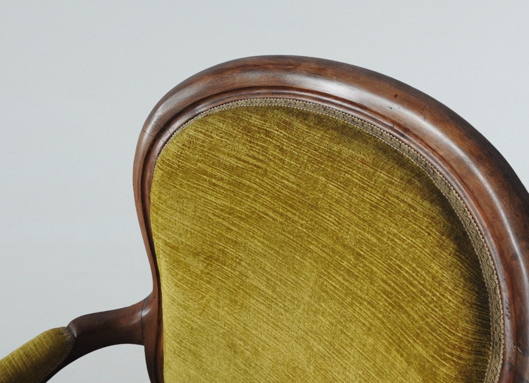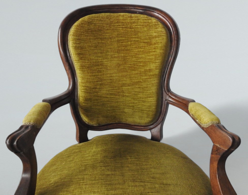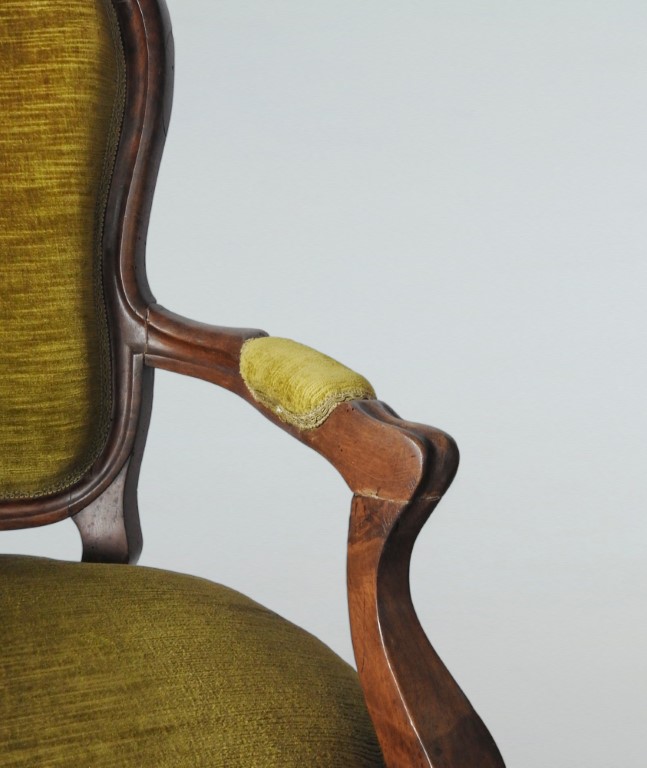 schienali sagomati, braccioli a giorno, gambe mosse, ricoperte in velluto verde