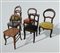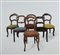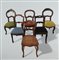 diverse fra loro, schienali sagomati, gambe mosse su piedi a ricciolo, ricoperte in tessuto colorato e cannetté