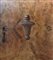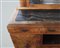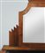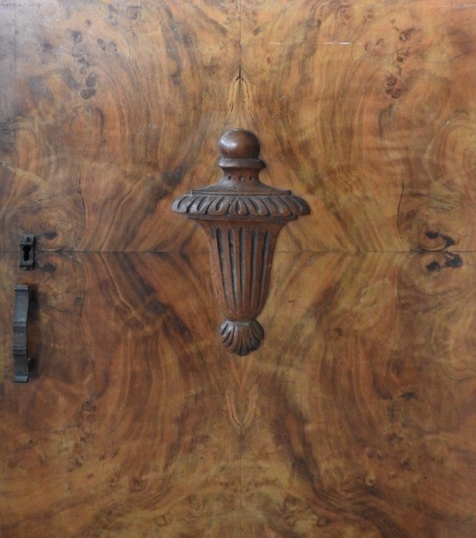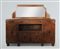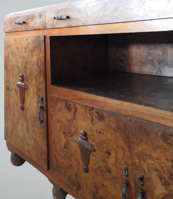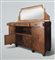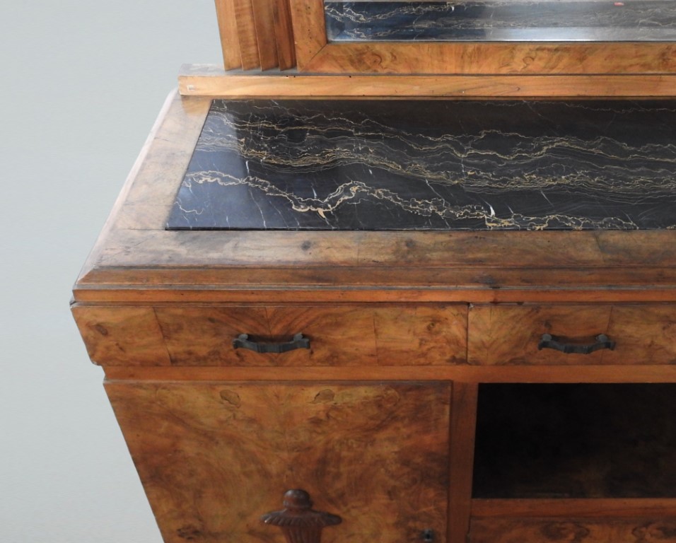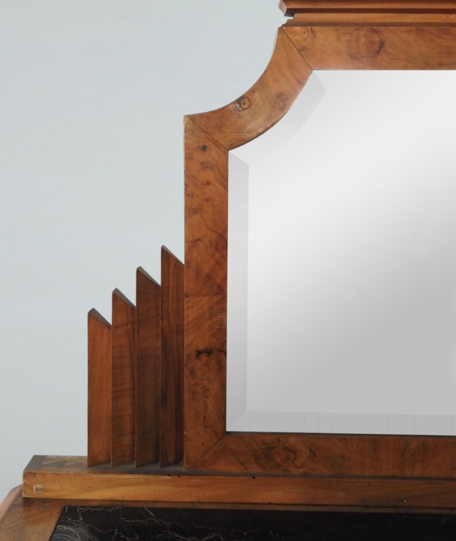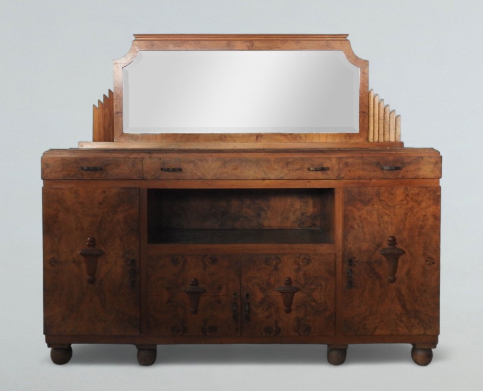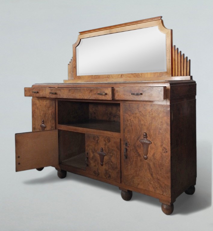 con alzata a specchio fra elementi scannellati, piano rettangolare, tre cassetti nella fascia, vano a giorno e quattro sportelli sottostanti decorati da motivo a vaso stilizzato, piedi a palla