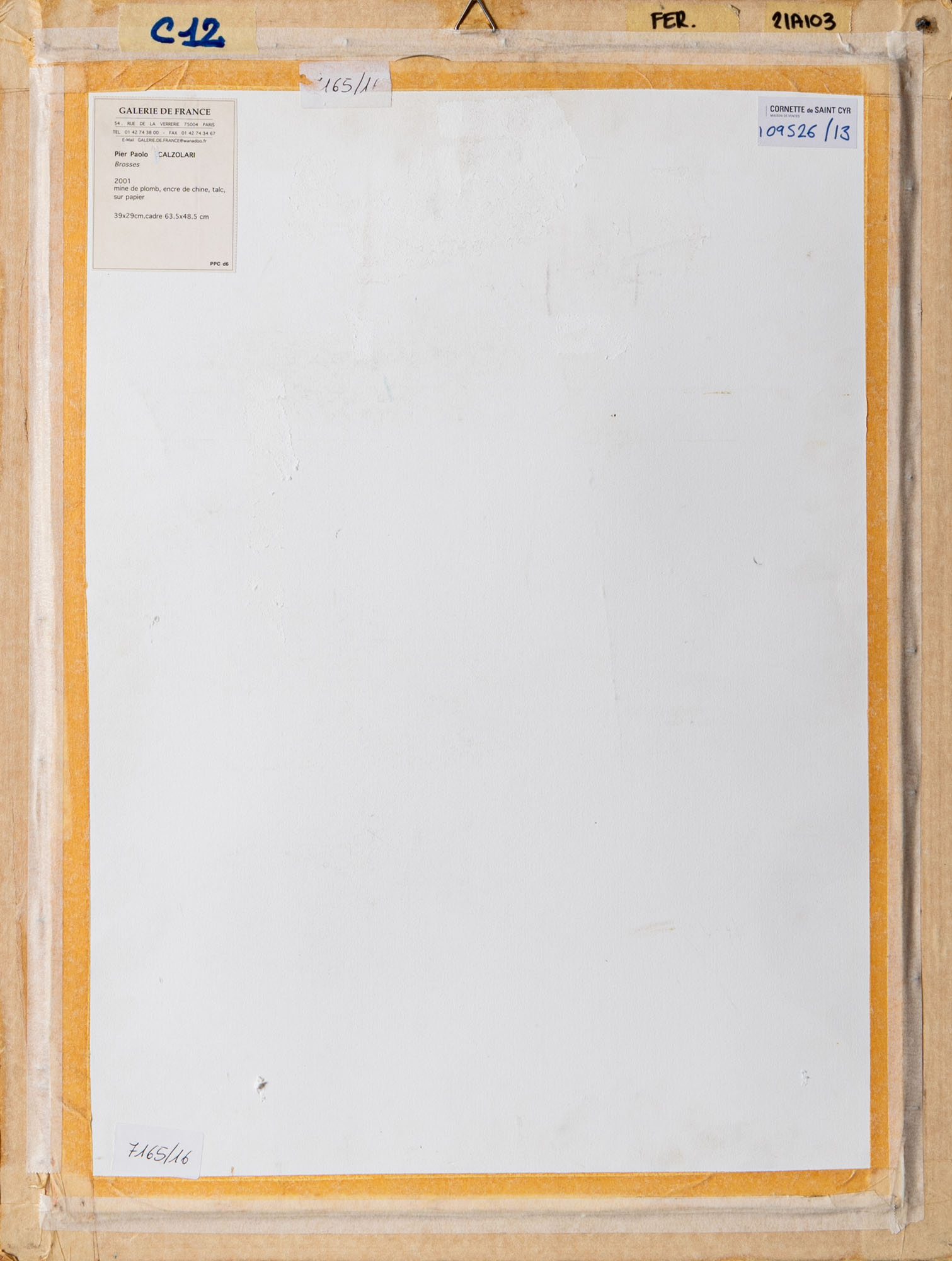 PIER PAOLO CALZOLARI(1943)Brosses2001Tecnica mista su carta39,8 x 29,9 cmFirmata in basso al centroOpera accompagnata da certificato di autenticità a cura della Fondazione Calzolari, FanoPROVENIENZA:Galerie de France, Parigi (etichette al retro)Collezione privata, Milano