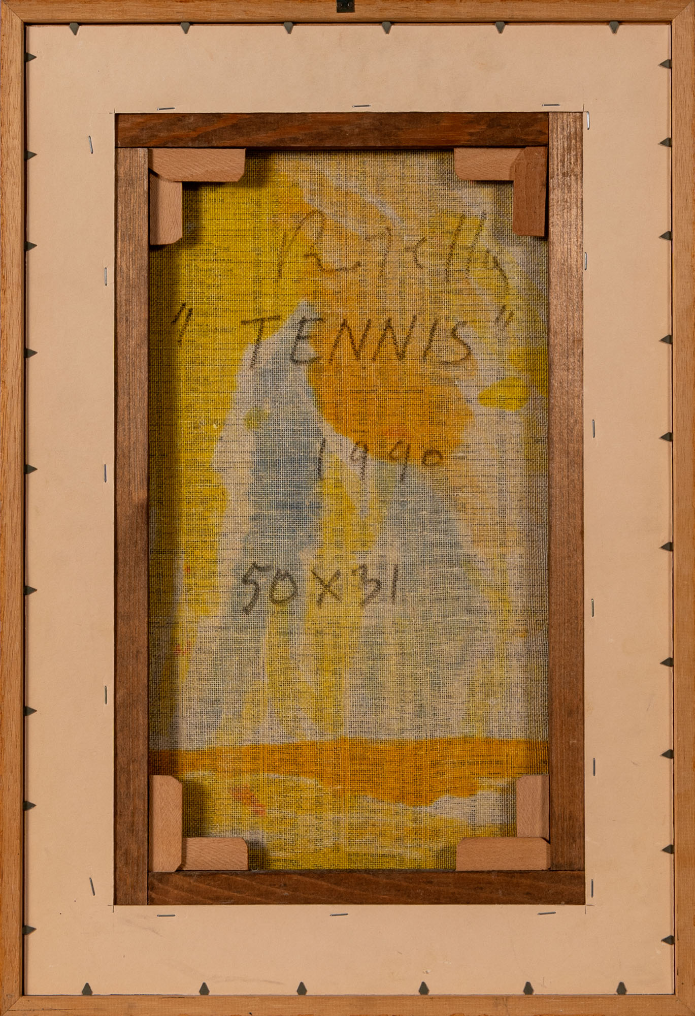 MIMMO ROTELLA(1918 - 2006)Tennis1990Sovrapittura su foglio di giornale applicato su tela49,5 x 31 cmFirmato in basso a sinistraFirma, data e titolo al retroPROVENIENZA:Collezione privata, ModenaESPOSIZIONI:Febbraio 1992, Mimmo Rotella. Il segno dei tempi, Per Mari e Monti - Associazione Culturale, MacerataBIBLIOGRAFIA:L. Cherubini, Mimmo Rotella. Il segno dei tempi, catalogo della mostra tenutasi presso Per Mari e Monti - Associazione Culturale, Macerata, 1992, s.p. (ill.)