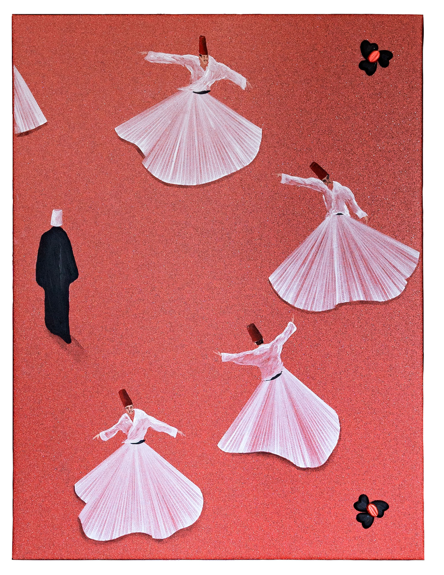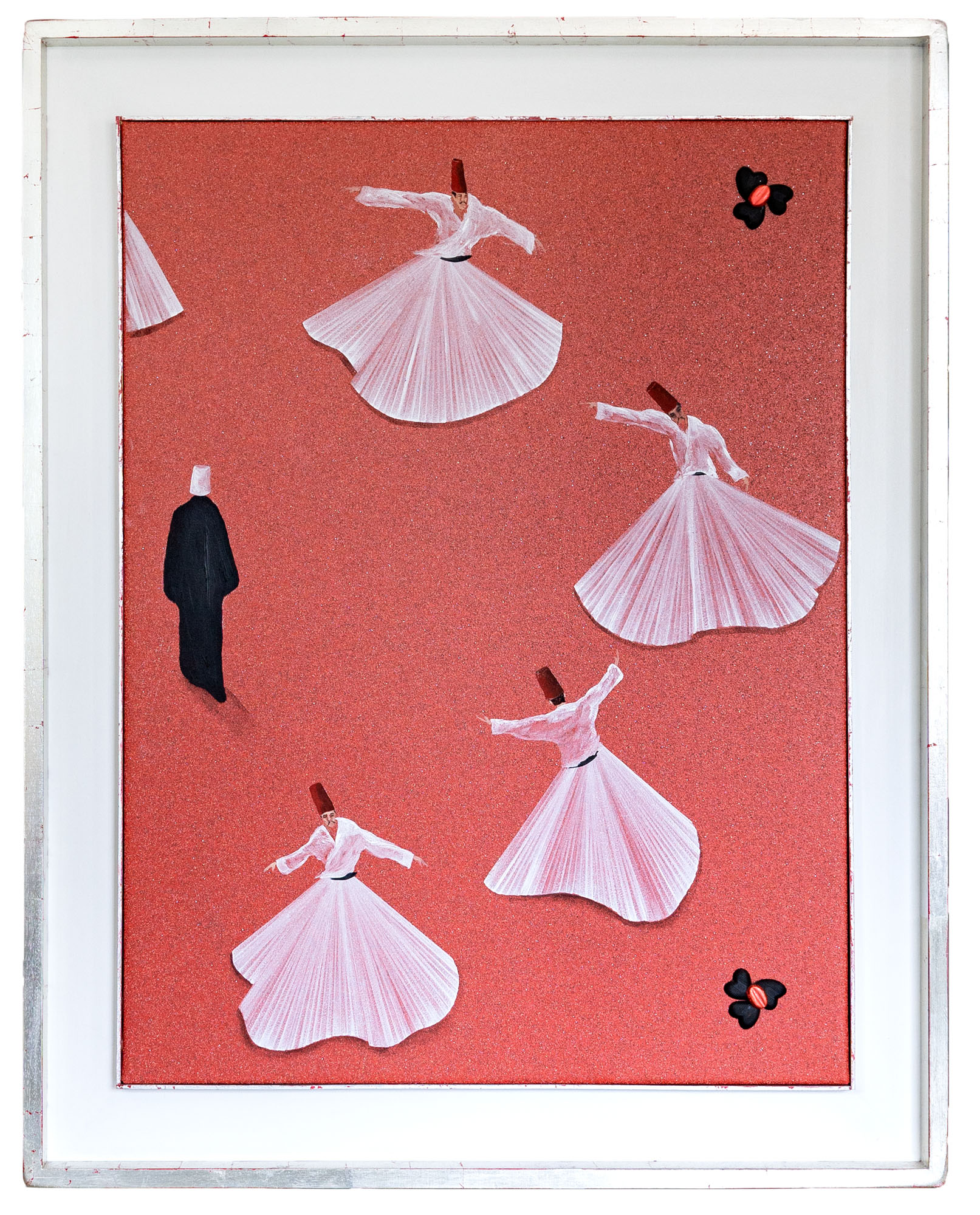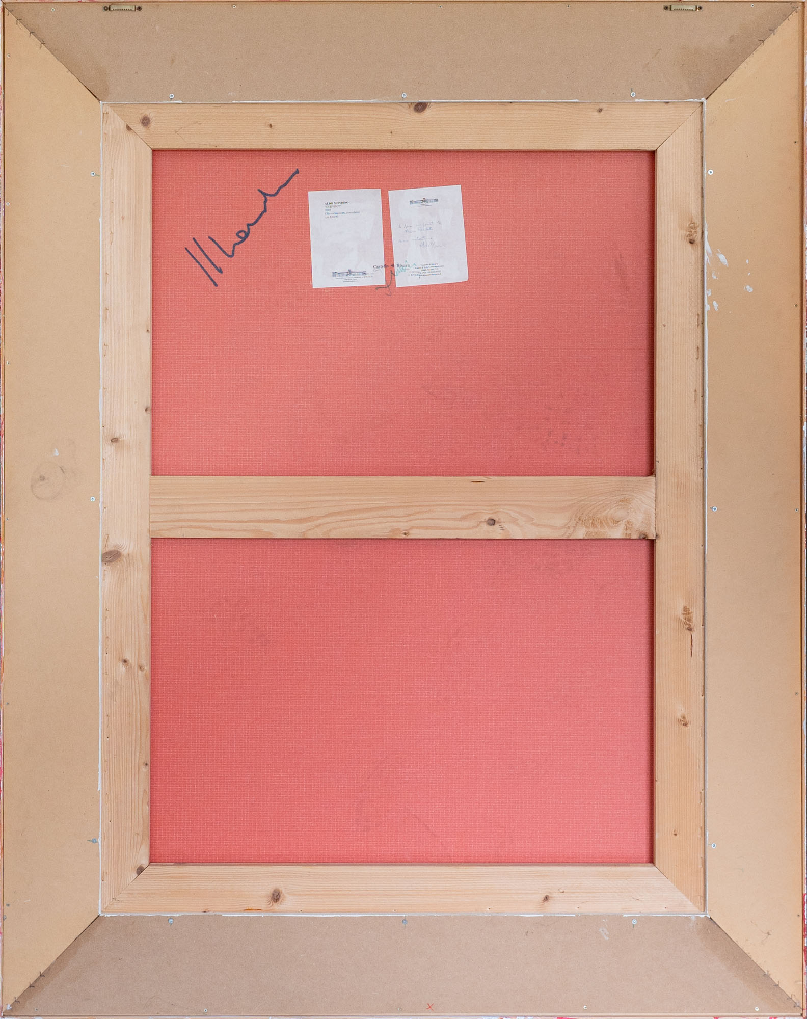 ALDO MONDINO(1938 - 2005)Dervisci2002Olio su linoleum con applicazione di cioccolatini120 x 90,5 cmFirma al retroDichiarazione di autenticità su etichetta al retro firmata dall'artistaPROVENIENZA:Castello di Rivara - Centro d'Arte Contemporanea (etichette e timbro al retro)Collezione privata, Carrara
