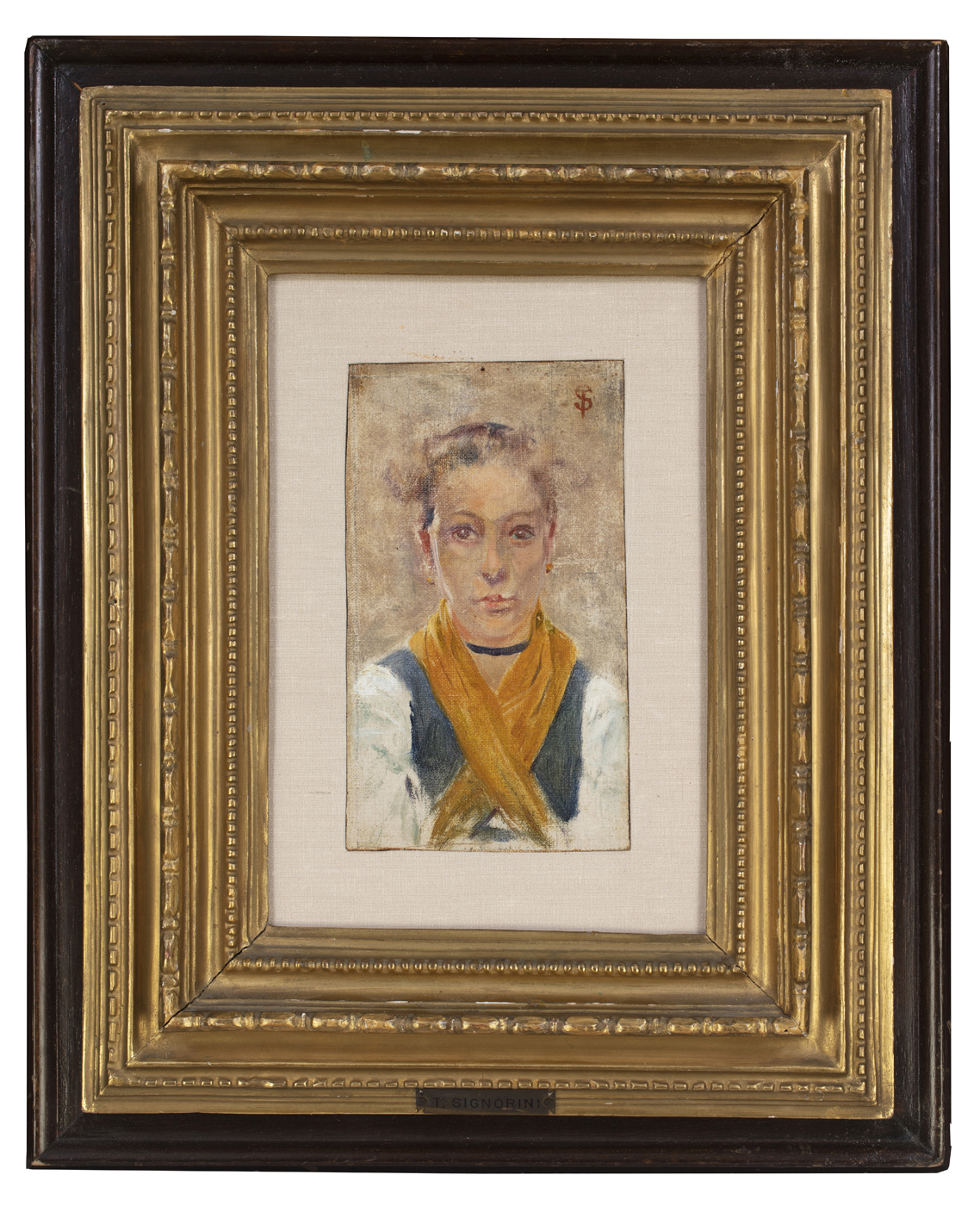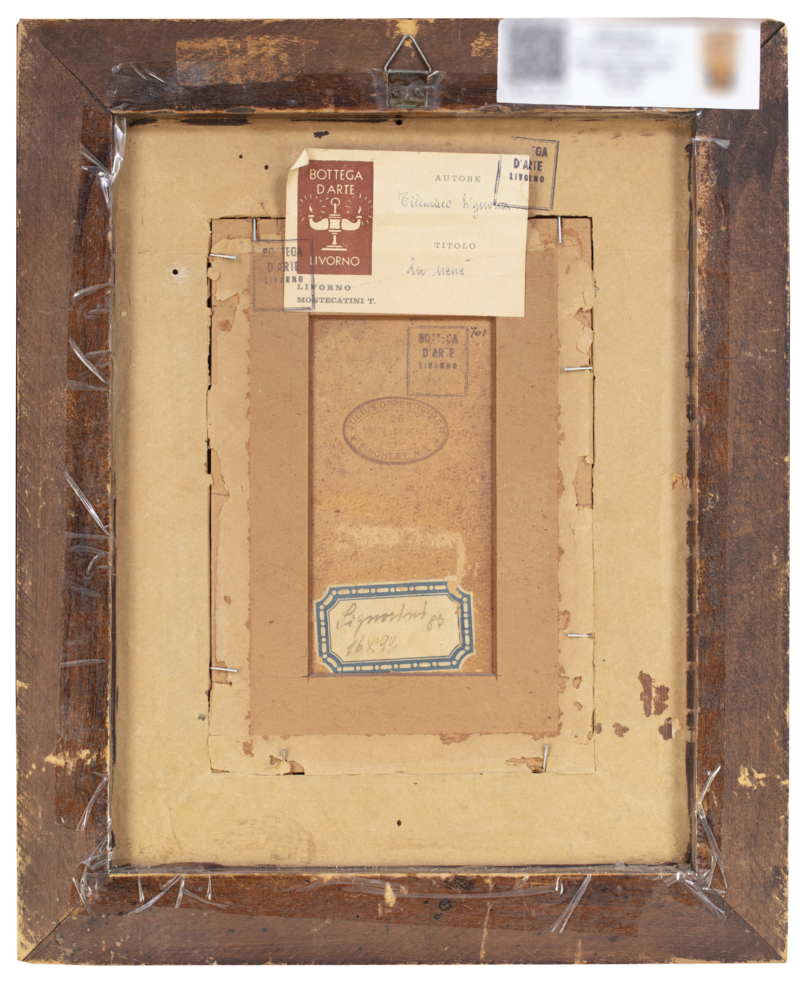 Elementi distintivi: al verso, etichetta "Bottega d'Arte Livorno" con indicazione dell'autore e del titolo e tre timbri della stessa galleria; una etichetta antica "Signorini 83" con dimensioni"; timbro "Julius Oppenheimer FINCHLEY"