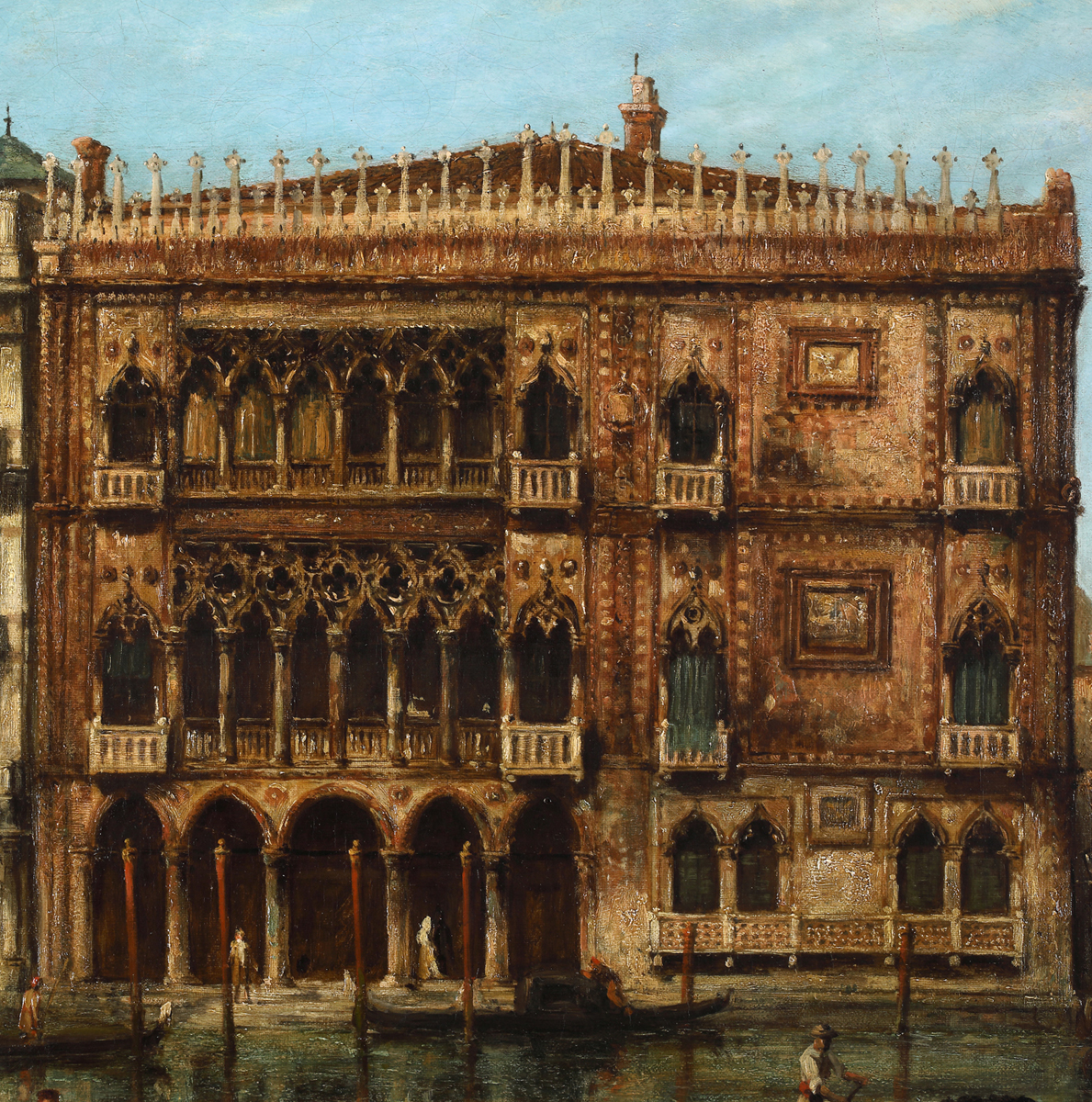 Di ciò è esempio questa veduta della Ca’ d’Oro vista dal Canal Grande, dipinta dopo che l'edificio era stato restaurato dell'ingegner Giovan Battista Meduna per volere del proprietario di allora, il principe russo Alessandro Troubetzkoy. La facciata si caratterizza per la marcata asimmetria tra la parte sinistra, in cui si sovrappongono tre fasce traforate (portico per l'attracco delle barche al piano terra e loggiati ai piani superiori), e l'ala destra, in cui prevale la muratura rivestita di marmi pregiati con singole aperture quadrate isolate: Haynes sottolinea, tuttavia, con un ductus denso, l'unico elemento che dà continuità alla facciata, condizionandola e dominandola, il grande cornicione con la soprastante merlatura e le triple colonnine tortili ai lati, con effetto che anticipa la pittura del secondo Ottocento, l'impasto ricco e luminoso di Luigi Nono, di Favretto, dei Ciardi.