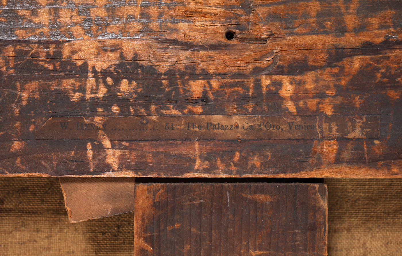 Elementi distintivi: sul telaio, etichetta di collezione "W. Henry" con numero di inventario ("25"), etichetta "FRONT HALL", con riguardo alla collocazione originaria; ulteriore etichetta "W. Henry ....... 51 The Palazzo Ca d'Oro, Venice"; ulteriore etichetta di corniceria