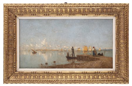A partire dal 1873 Guglielmo Ciardi si afferma come cantore della laguna veneta, erede predestinato di Canaletto, Guardi e Bellotto (Stefano Bosi, “Il cantore della laguna veneta: I cicli delle ‘basse maree’ e dei ‘pescatori in laguna’”, in Enzo Savoia, Francesco Luigi Maspes, a cura di, "Guglielmo Ciardi protagonista del vedutismo veneto dell'Ottocento", Crocetta del Montello, 2013, pp. 92-95). Allievo della scuola di paesaggio istituita da Domenico Bresolin presso l’Accademia di belle arti di Venezia, l’artista aveva saputo creare un felice connubio tra la tradizione veneta, di cui riprende atmosfere e tavolozza, con le ricerche più innovative del suo tempo tra “macchia” e “vero”. Il peculiare punto di vista della terra vista dal mare o da uno degli isolotti della laguna gli aveva permesso di operare tale sintesi e di lavorare sul motivo cogliendo le infinite variazioni degli effetti di luce sulla superficie dell’acqua. Il mare è sempre calmo e le rare figure umane sono operose, in un’armoniosa compenetrazione tra uomo e natura, che si trasfigura una dimensione serena e atemporale. Si tratta di veri e propri cicli, in cui viene nel corso degli anni preso nota di ogni dettaglio atmosferico e di ogni attività umana attraverso dipinti tutti diversi l’uno dall’altro. Dopo un soggiorno a Parigi per visitare l’Esposizione universale del 1878 la pittura di Ciardi si fa matura e internazionale, come attestato dall’opera in esame proveniente dal mercato americano e datata 1880 sulla vela color avorio della sesta imbarcazione da sinistra. La pennellata diviene più liscia e il contrasto cromatico tra le zolle di terreno e l’acqua più evidente. Una donna con due bambini osserva da un piccolo molo, che chiude la composizione, le vele delle barche da pesca che si dispiegano sulla laguna. Il cielo appena corrusco di nubi si riflette placido sulla superficie del mare, che segna tutto il contorno del dipinto. L’artista orchestra con sapienza le variazioni cromatiche, passando in basso dal marrone all’azzurro, lungo la linea dell’orizzonte dall’azzurro all’avorio degli edifici, tratteggiati con fare miniaturistico, e a destra dall’azzurro al cobalto dei colli in lontananza.