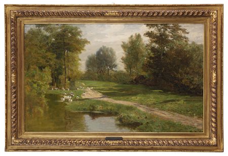 Appartiene alla serie delle vedute ottobrine l’opera in esame, una veduta fluviale orchestrata sui toni del verde. Asse portante del dipinto è il sentiero campestre che bipartisce lo spazio. La sinistra è occupata dallo specchio d’acqua su cui si riflettono cielo e alberi dalle foglie ingiallite; la destra dalla vegetazione le cui ombre colorate si allungano sul prato. Il cielo chiaro, che tende quasi al bianco, annuncia la fine della stagione calda e prelude all’arrivo dei primi freddi. Unica presenza, in uno spazio privo di alcuna figura umana, è il gruppo di oche che stazionano tra acqua e terra.