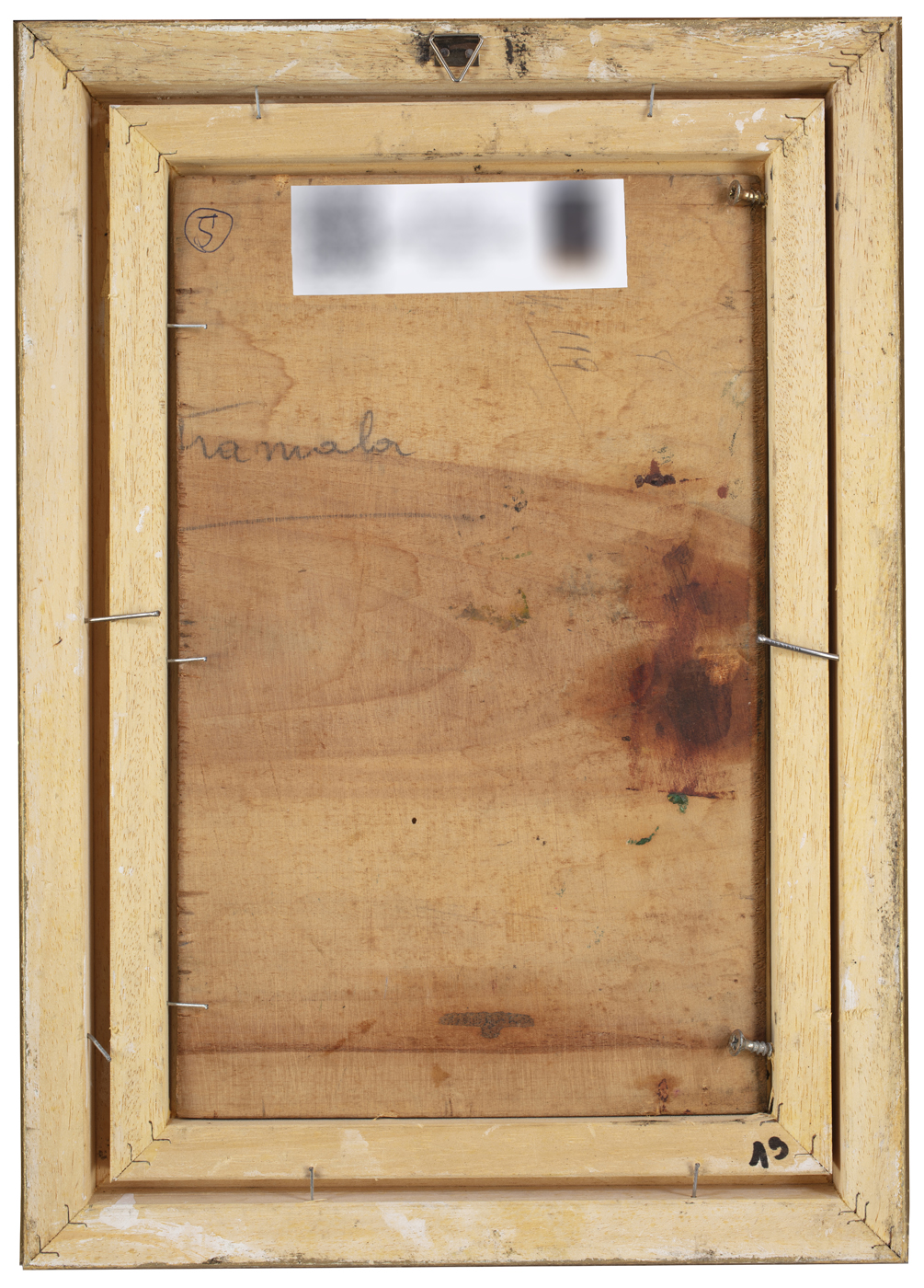 Elementi distintivi: al verso della tavola "5" a penna in cerchio, "119" a matita e "19" a pennarello sul telaio