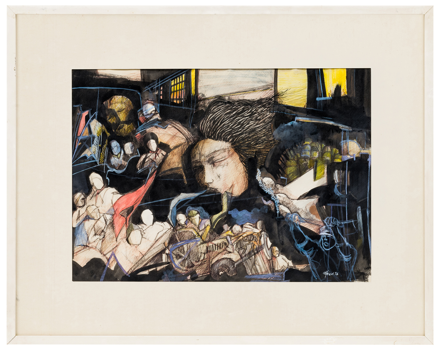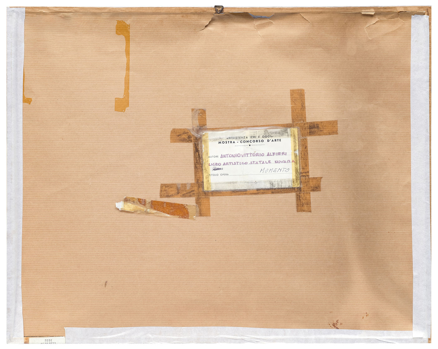 Elementi distintivi: sul verso, etichetta della mostra concorso “Resistenza ieri e oggi” con titolo dell’opera; sulla cornice, etichetta della Banca Popolare di Intra con riferimenti di inventario
