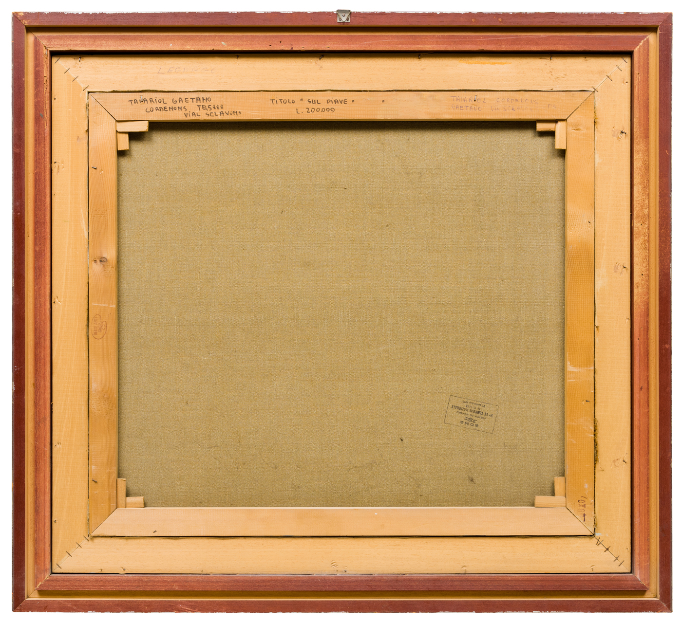 Elementi distintivi: al verso della tela, timbro di partecipazione alla mostra Concorso SOMS - 11a ex tempore nazionale di pittura di Crocetta del Montello, 1975; sul telaio, timbro con indicazione delle misure del telaio; sul fianco della cornice etichetta della Banca Popolare di Asolo e Montebelluna con riferimento inventariale