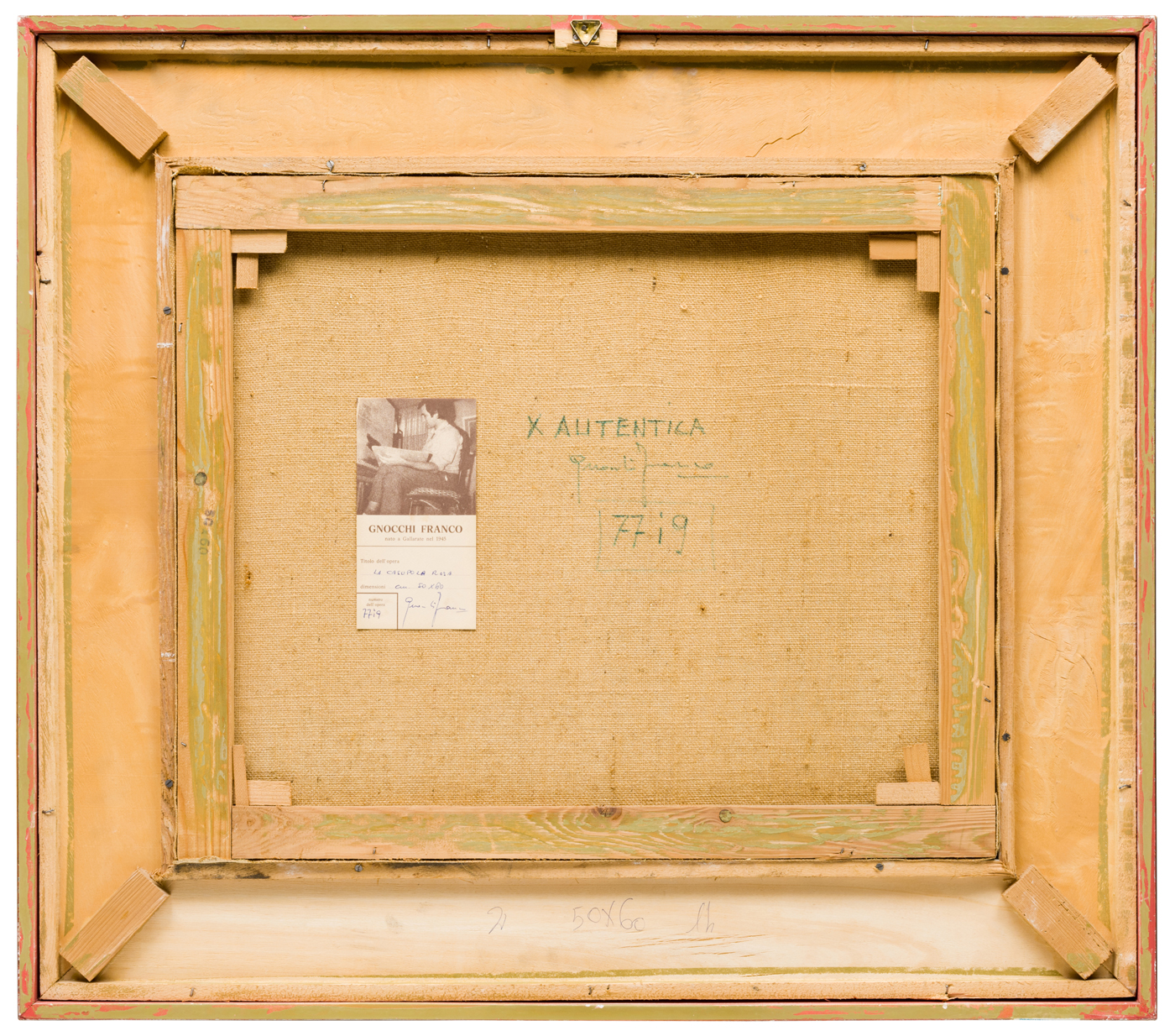 Certificati: sul verso certificato di autenticità con titolo, dimensioni, firma dell’autore e numero di inventario “77i9”
