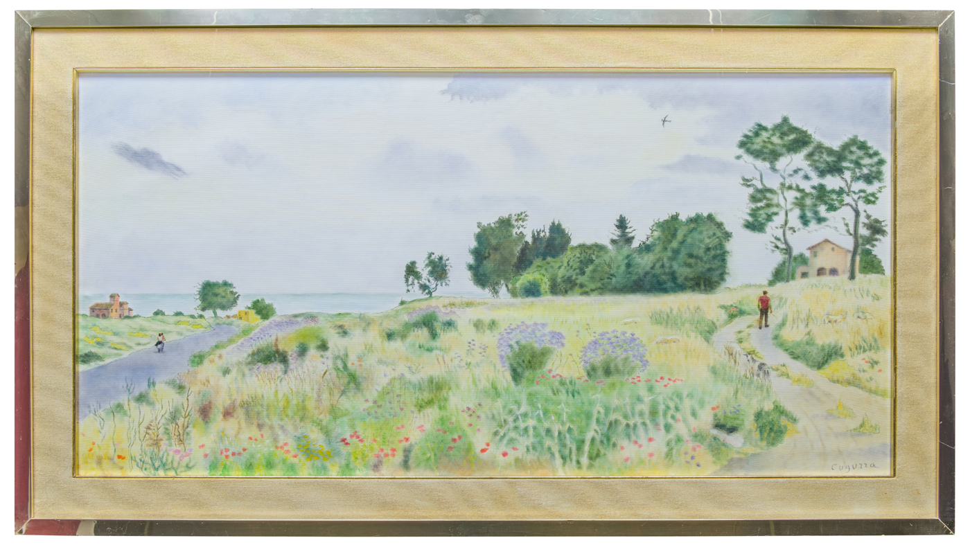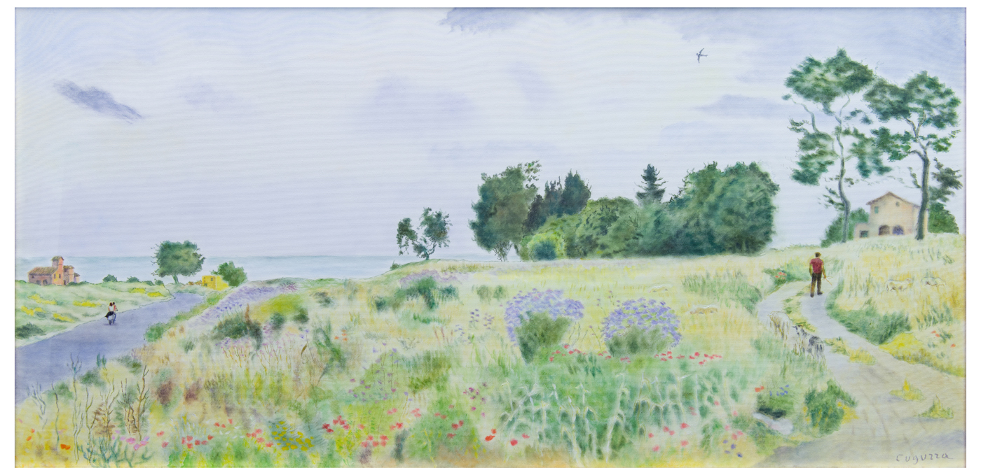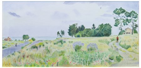 Altre iscrizioni: sul verso, “Lazio: campo selvatico (papaveri, cardi fioriti, malva) alberi; pastore e pecore sul sentiero davanti al mare, al crepuscolo”