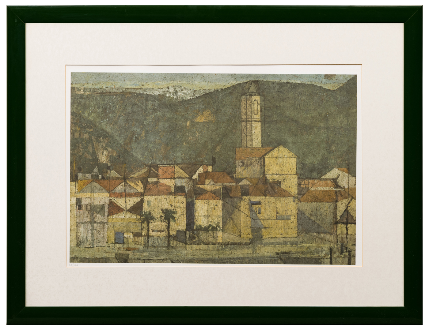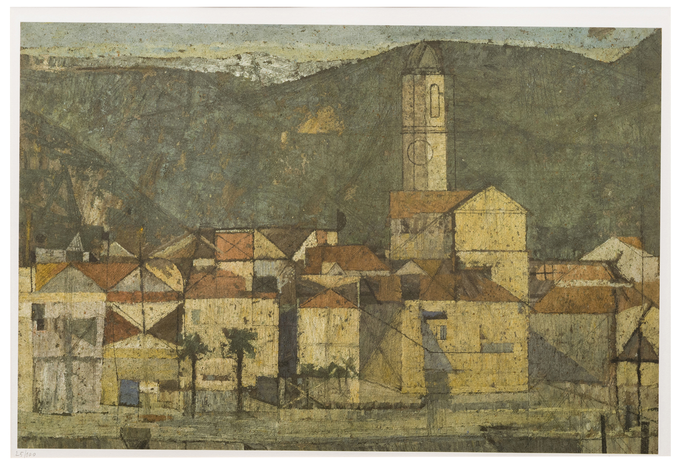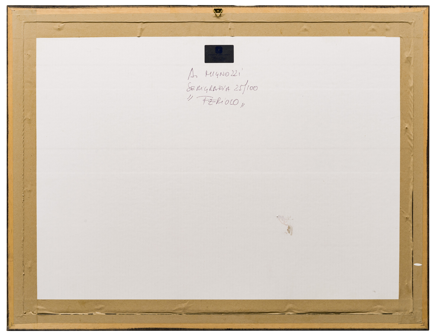 Altre iscrizioni: indicazione della tiratura a matita al recto, “25/100”; a penna, al verso della cornice, indicazione dell’autore, della tecnica (erroneamente indicata in serigrafia), della tiratura, del soggetto (“Feriolo”)