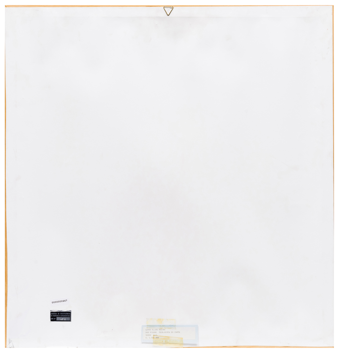 Elementi distintivi: sul verso, una etichetta anonima con dati dell’opera; etichetta della Cassa di Risparmio di Fabriano e Cupramontana con riferimenti di inventario
