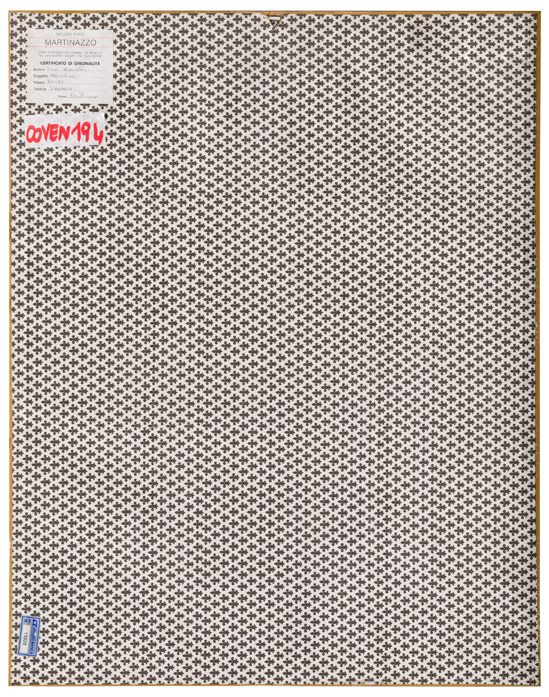 Elementi distintivi: al verso etichetta della galleria Martinazzo, Montebelluna, con dati dell’opera e certificato di originalità; due etichette con riferimento agli inventari della banca