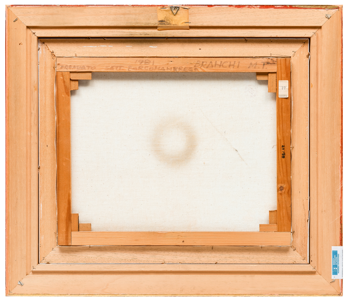 Elementi distintivi: sulla cornice, etichetta della Banca Popolare di Intra con riferimenti di inventario; sul telaio, etichetta di esposizione “Borgomanero n. 22”