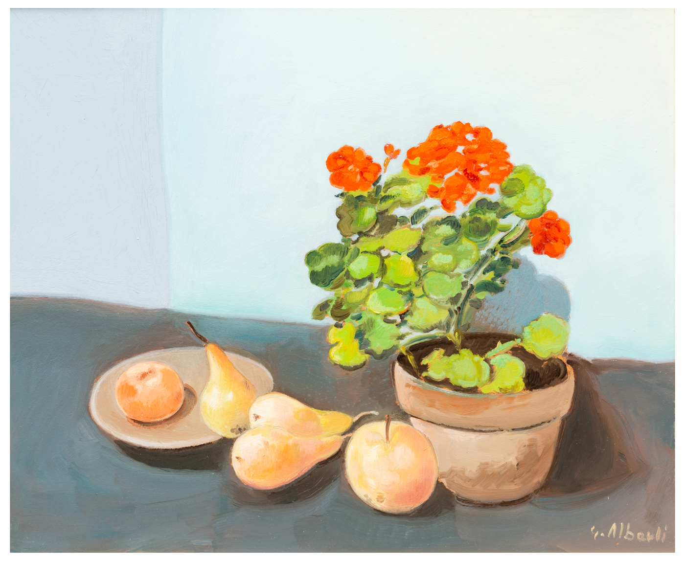 Gino Alberti (1921 - 1990) Natura morta con pere e geranei