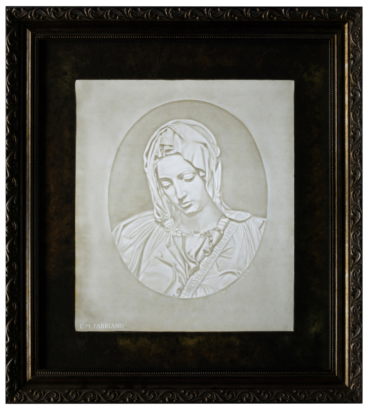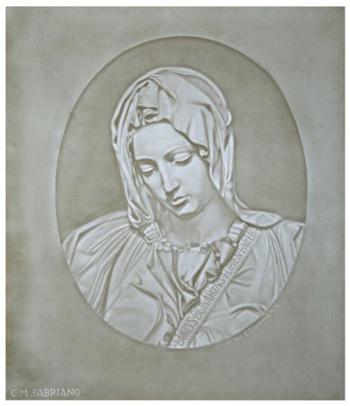 In asta, un esemplare di filigrana artistica in chiaroscuro, realizzata da Luigi Filomena, per la storica Cartiera Miliani, di Fabriano, sul modello celeberrimo della "Pietà" di Michelangelo. Come ricorda Annarita Librari, figlia dell'incisore in filigrana Franco Librari, "Con Giuseppe Miliani (1816 - 1890), nipote di Pietro (1744 - 1817), fondatore della ditta Miliani, la cartiera si ingrandisce, la carta da disegno si afferma come la migliore, tanto che alla esposizione di Londra nel 1851 viene premiata, e la carta valori comincia ad essere la specialità della fabbrica fabrianese. Alla morte di Giuseppe la cartiera era già un grande complesso, ma sarà il figlio Giambattista (1856-1937) ad operare l’effettiva trasformazione da azienda artigianale ad industriale (...). Giambattista alle conoscenze tecniche unisce un’ampia visione dell’organizzazione industriale grazie ai frequenti viaggi che, fin da giovanissimo, compie in diverse nazioni europee e in Nord America. Nel 1889 riceve la Legion d’onore per aver presentato, all’esposizione di Parigi, le migliori filigrane per i biglietti di banca. Per le filigrane di Fabriano, ancor prima del riconoscimento parigino, esisteva un vero e proprio entusiasmo. Nel 1886 Ernst Kirchner di Francoforte sul Meno scrive: “Le vostre carte filigrane sono le più belle che io abbia mai veduto fino ad ora. Da quando posseggo questi veramente artistici fogli non oso più nemmeno guardare gli stessi prodotti della Germania. I ritratti, come pure i dettagli che li ornano sono di una finezza ammirabile, perfetta e formano ora il punto essenziale di questa modesta collezione che io curo con molto amor proprio”. Nel settore della Filigrana artistica in chiaro-scuro per banconote Giambattista, in un primo momento, per l’incisione su cera si avvalse del prof. Bianchi di Roma, medaglista dei Sacri Palazzi Apostolici, che direttamente da Roma inviava a Fabriano le cere commissionate. Successivamente, la sua lungimiranza e previdenza lo spinsero a dotare l’Officina Filigrane delle cartiere di Fabriano della sezione di incisione su cera, dove destinò giovani e abili artisti che riuscirono a soddisfare appieno le esigenze aziendali. Capostipite di questa scuola fu Serafino Cilotti (1868-1943), che realizzò opere di notevole impatto artistico, da considerare come una nuova forma di espressione d’arte figurativa su cera, Angelo Bellocchi (1880-1939) e Virgilio Brozzesi (1869-1946). Allievi di Cilotti possono considerarsi Aldo Frezzi (1885-1972), (...) Eraldo Librari (1907-1988) e Luigi Filomena. ( Annarita Librari, "Cera una volta... la Filigrana Artistica in chiaroscuro"). La storia della cartiera Miliani è stata ricostruita da Bruno Bravetti, nella monografia “Giambattista Miliani”, Affinità Elettive, 2010