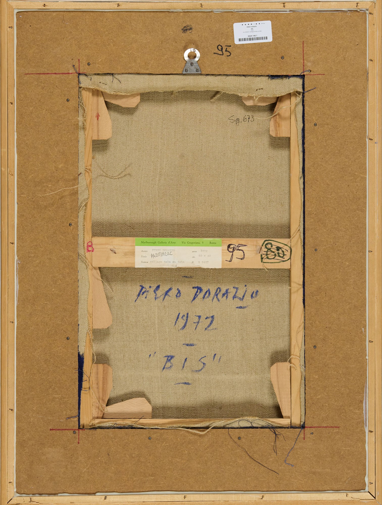 Sul verso: firma, data, titolo ed etichetta galleria d'arte "Marlborough", Roma, con descrizione.
