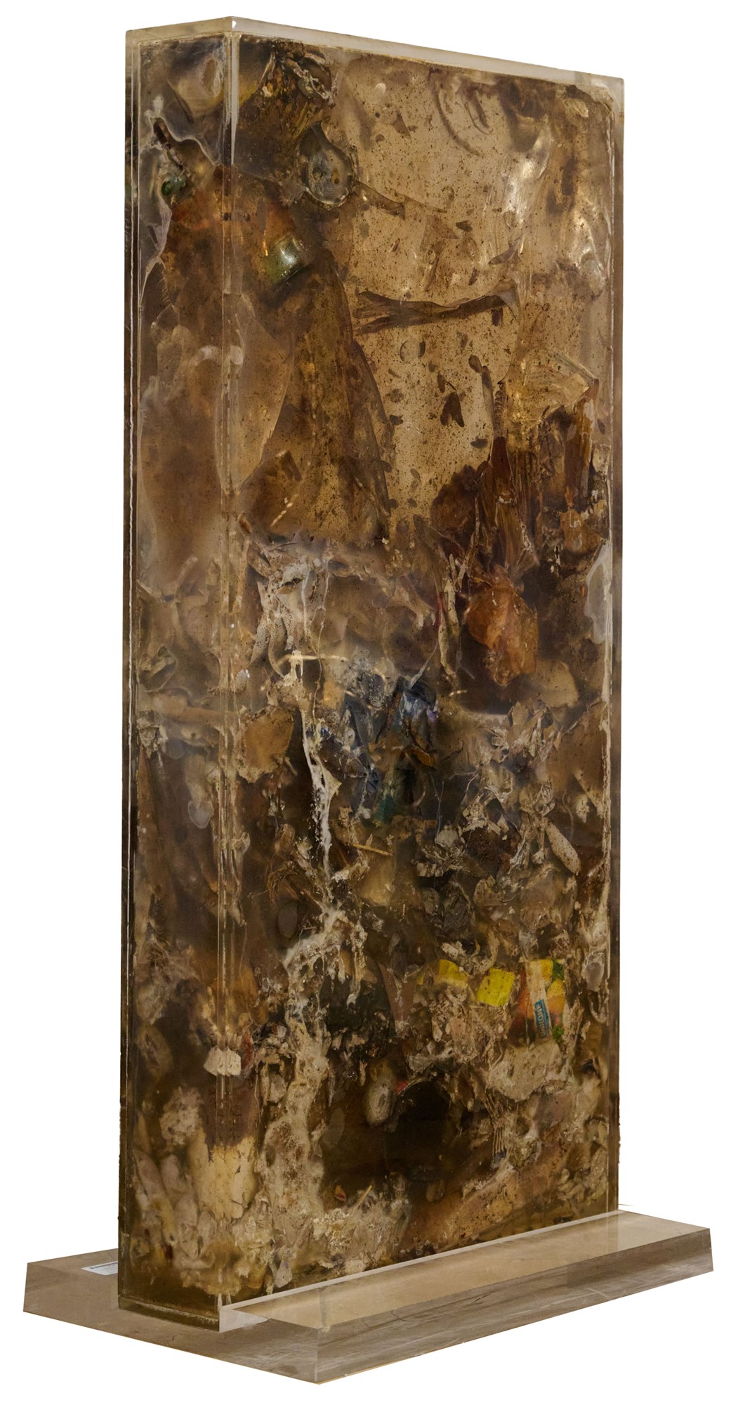 Accumulo di rifiuti e rifiuti bruciati in resina, racchiuso in plexiglas cm. 101x50x11
