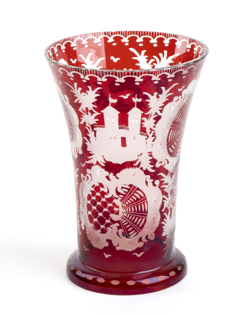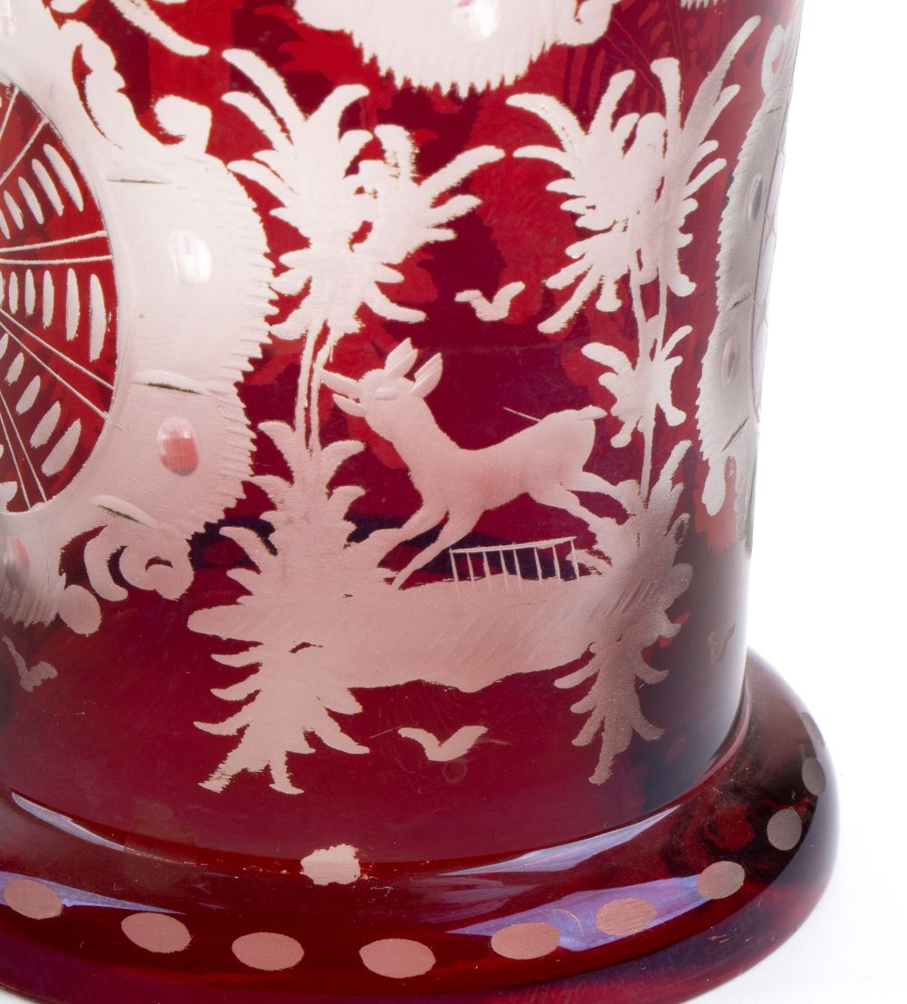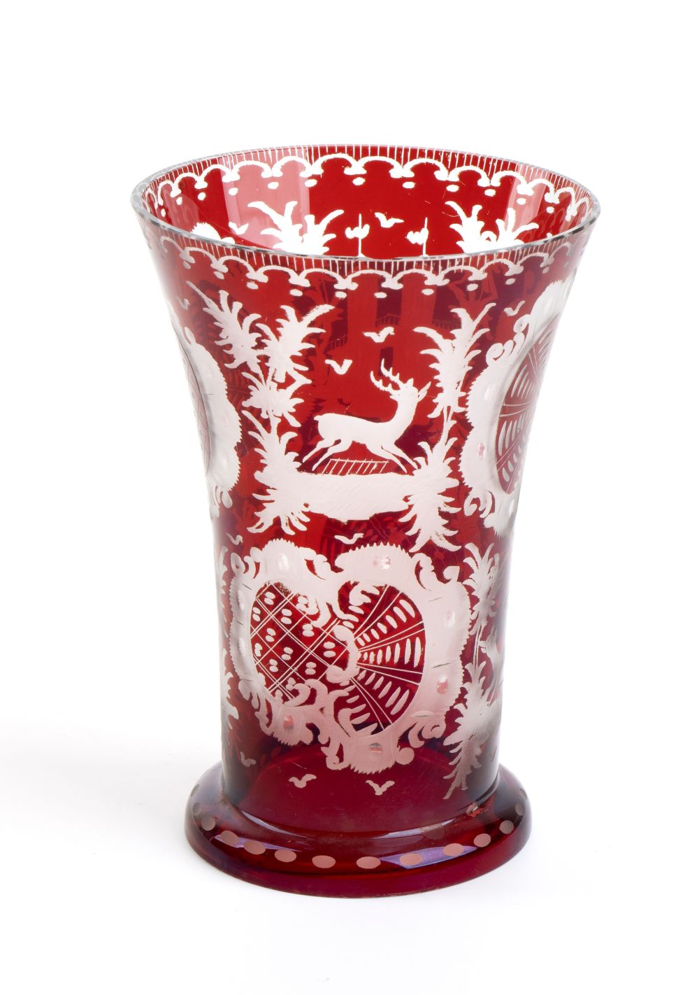 di colore rubino, molato e inciso con decori floreali e animali in stile Biedermeier.