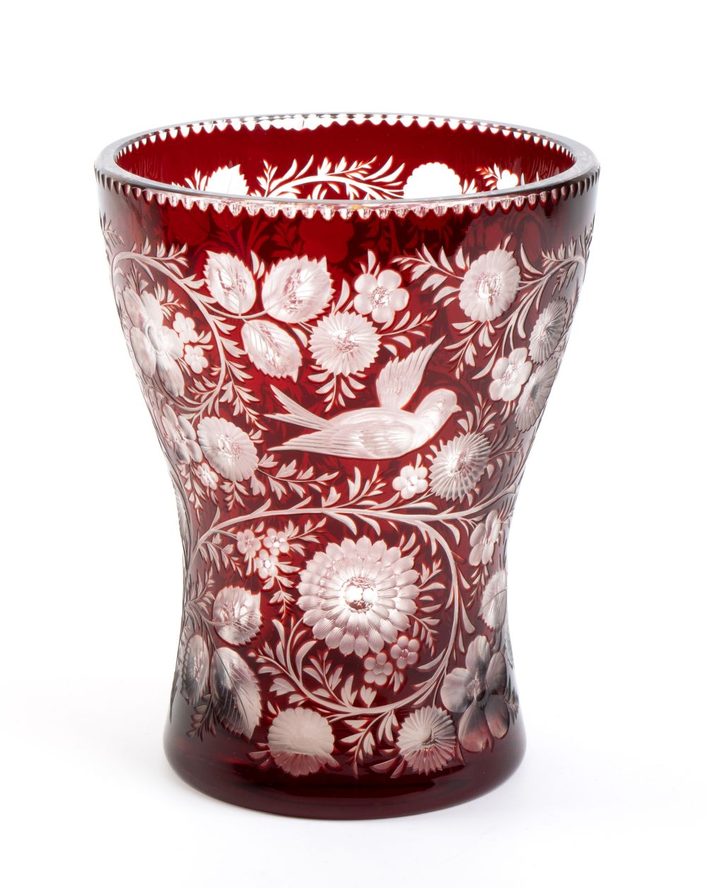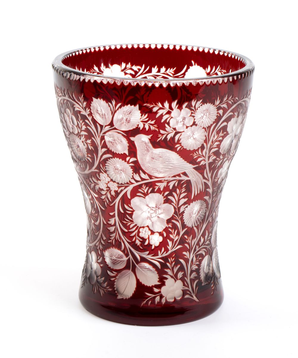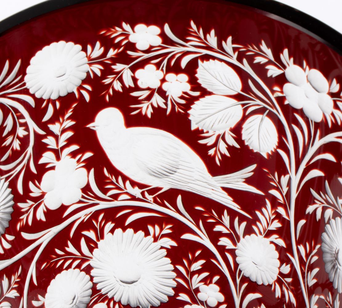 di colore rubino, molato e inciso con decori floreali e uccelli in stile Biedermeier.