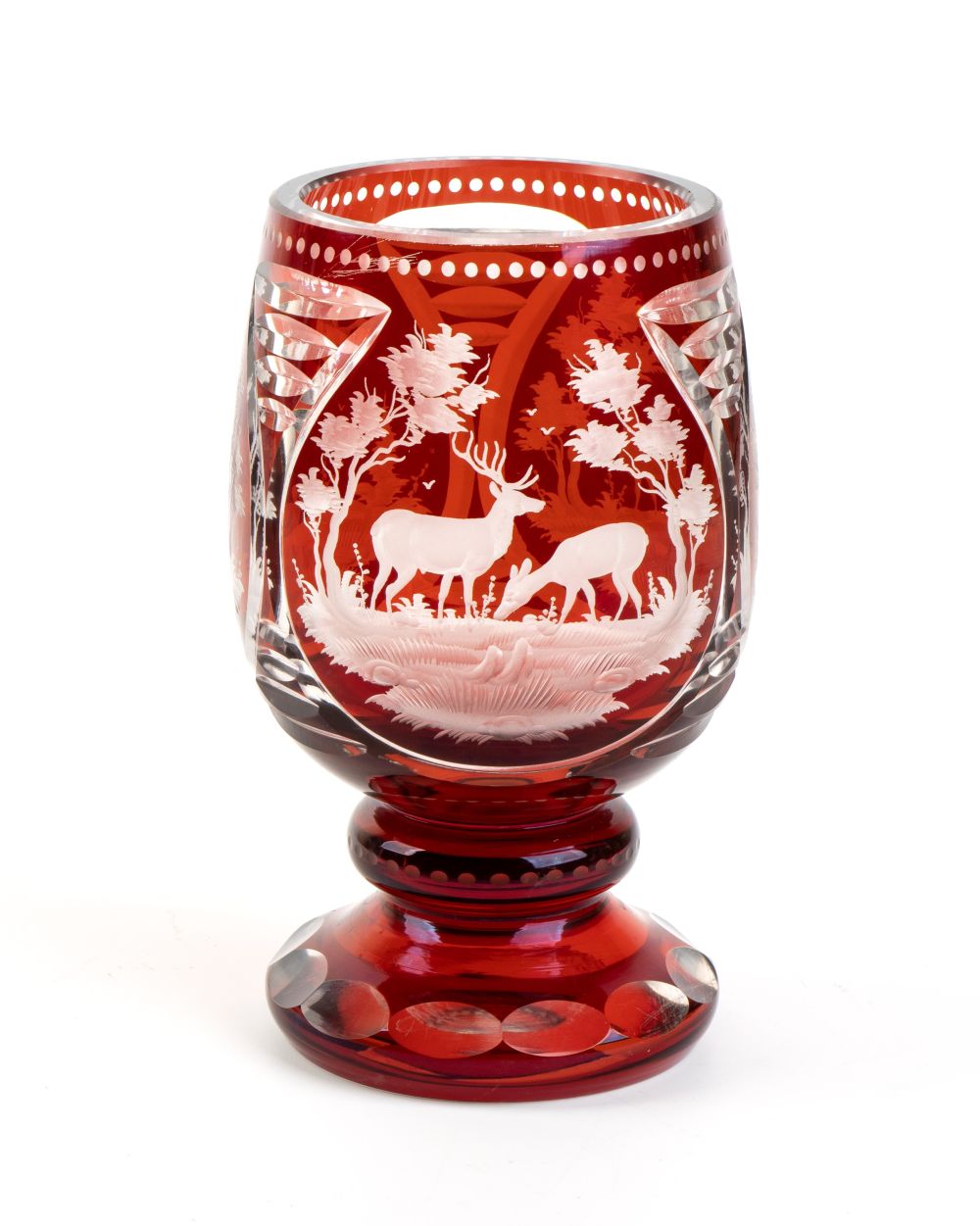 di colore rubino, molato e inciso con paesaggi, uccelli e animali in stile Biedermeier.