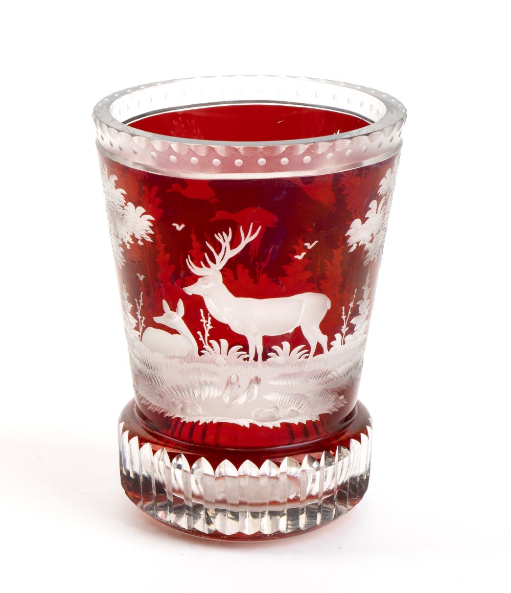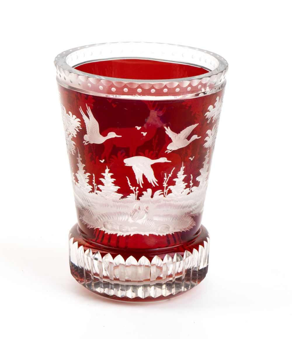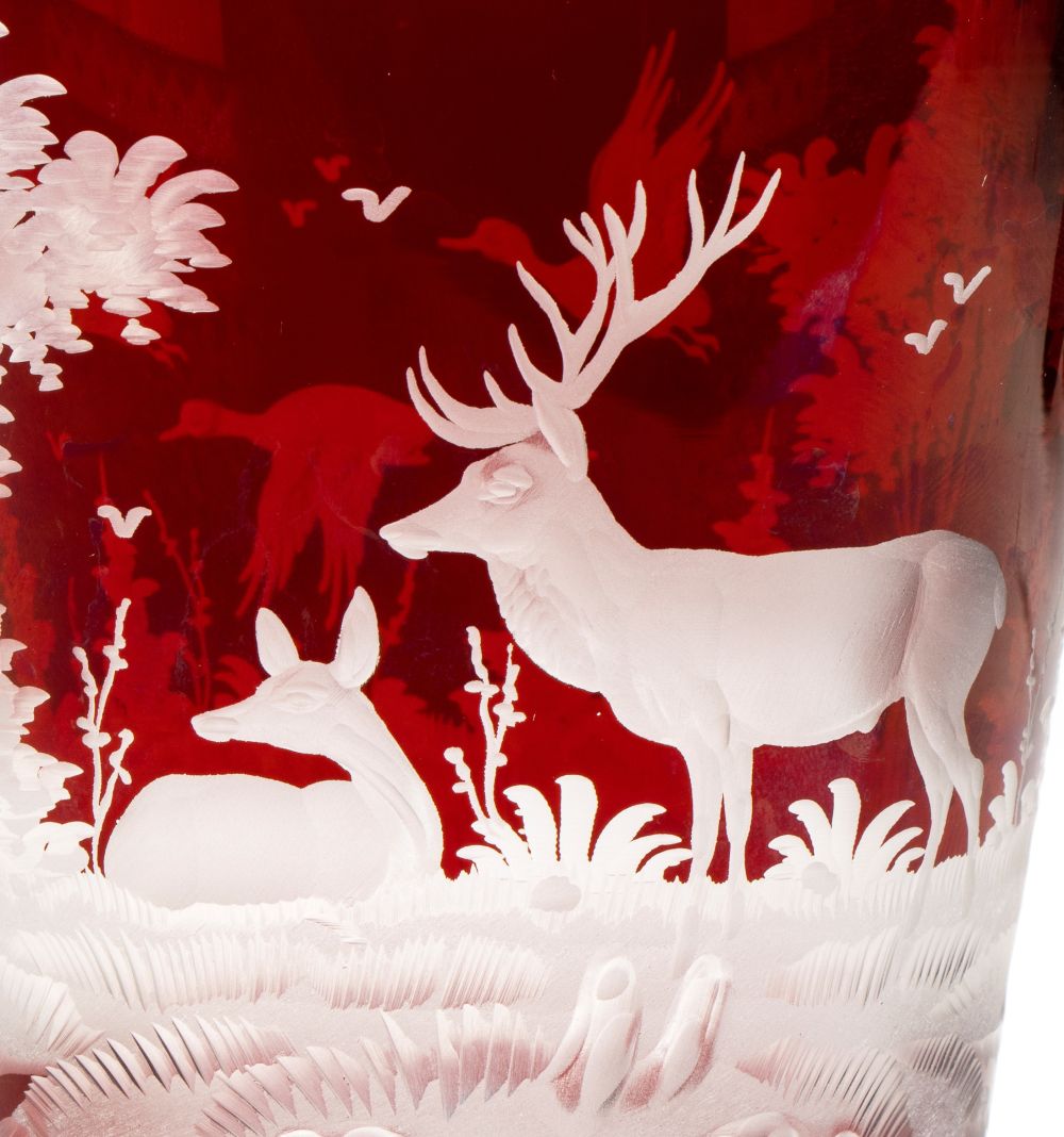 di colore rubino, molato e inciso con paesaggi ed animali in stile Biedermeier.