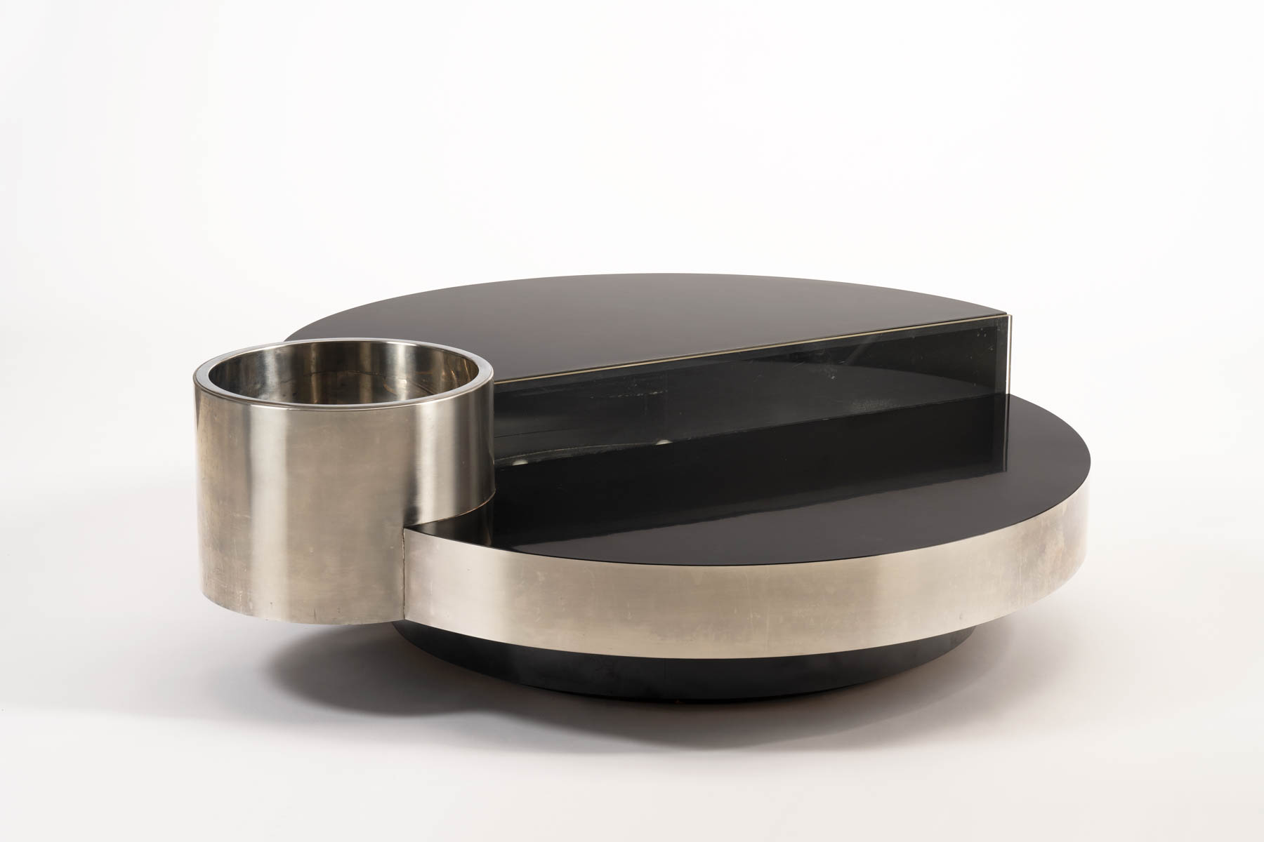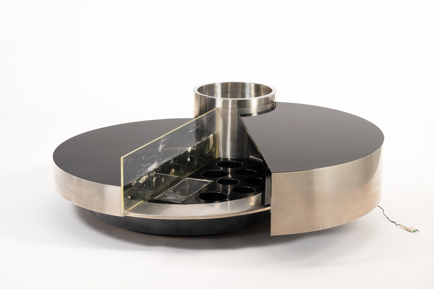 Apribile con all’interno compartimenti per le bottiglie, 44 x 121 x 136 cm, struttura in legno rivestito in laminato nero, lamina d’acciaio, interno in plexiglas, lieve abrasione al bordo della base con perdita minimale della copertina in laminato. Plexiglas strisciato e con macchie bianche. Produzione Sabot