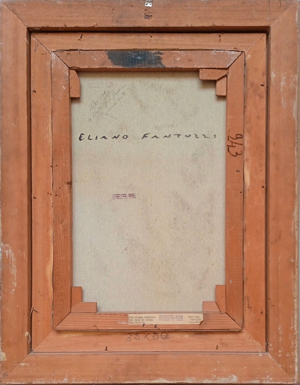 Eliano Fantuzzi (Modena 1909 - Verona 1987), Vaso di fiori. Cm. 50x35. Olio su tela. Opera firmata in basso a sinistra Fantuzzi. Al retro opera firmata Eliano Fantuzzi. Al retro reca timbro e etichetta della Galleria Contemporarte di Sergio Denti, Bologna. Corredata da autentica su fotografia dell'autore e Sergio Denti. Riporta impronta digitale del pittore.