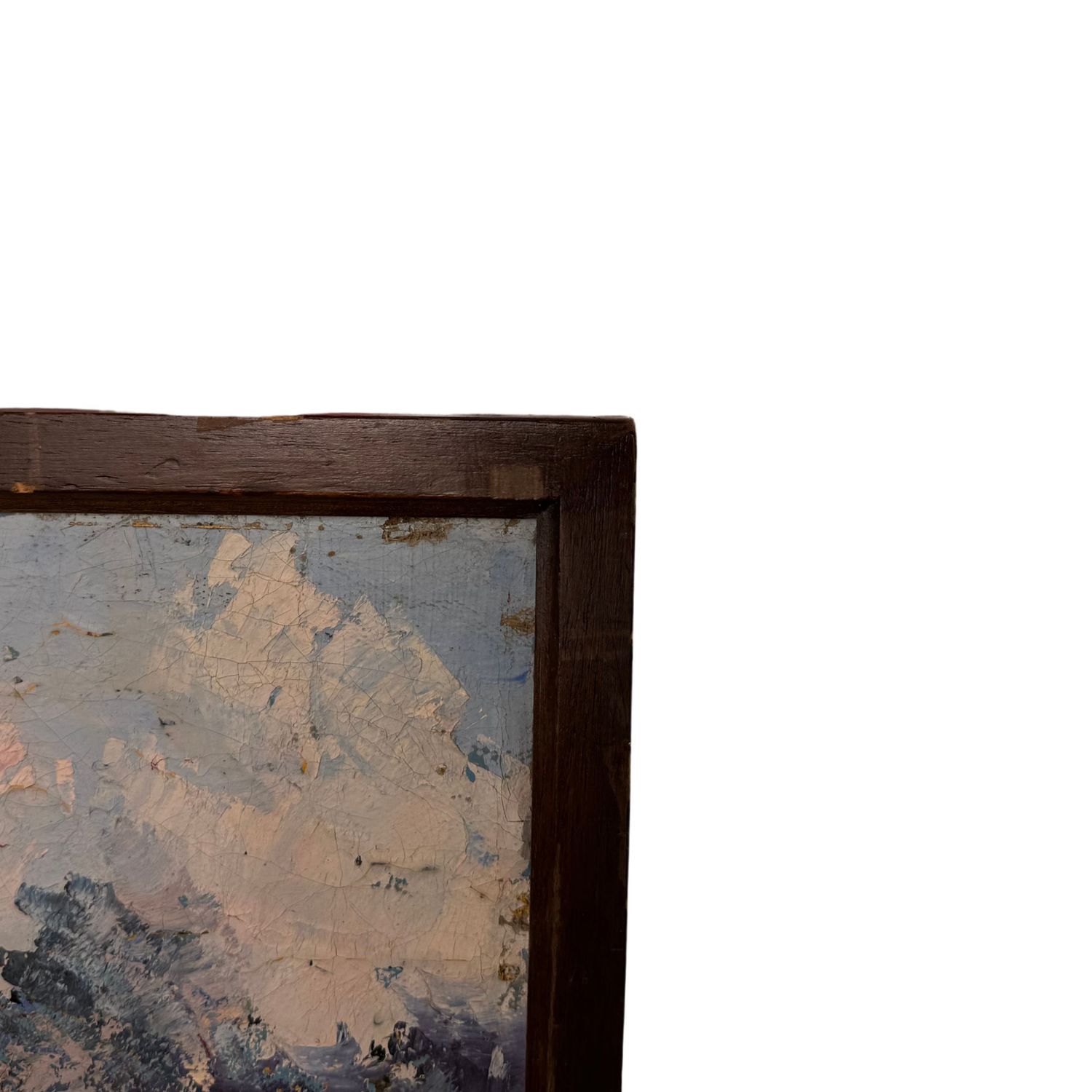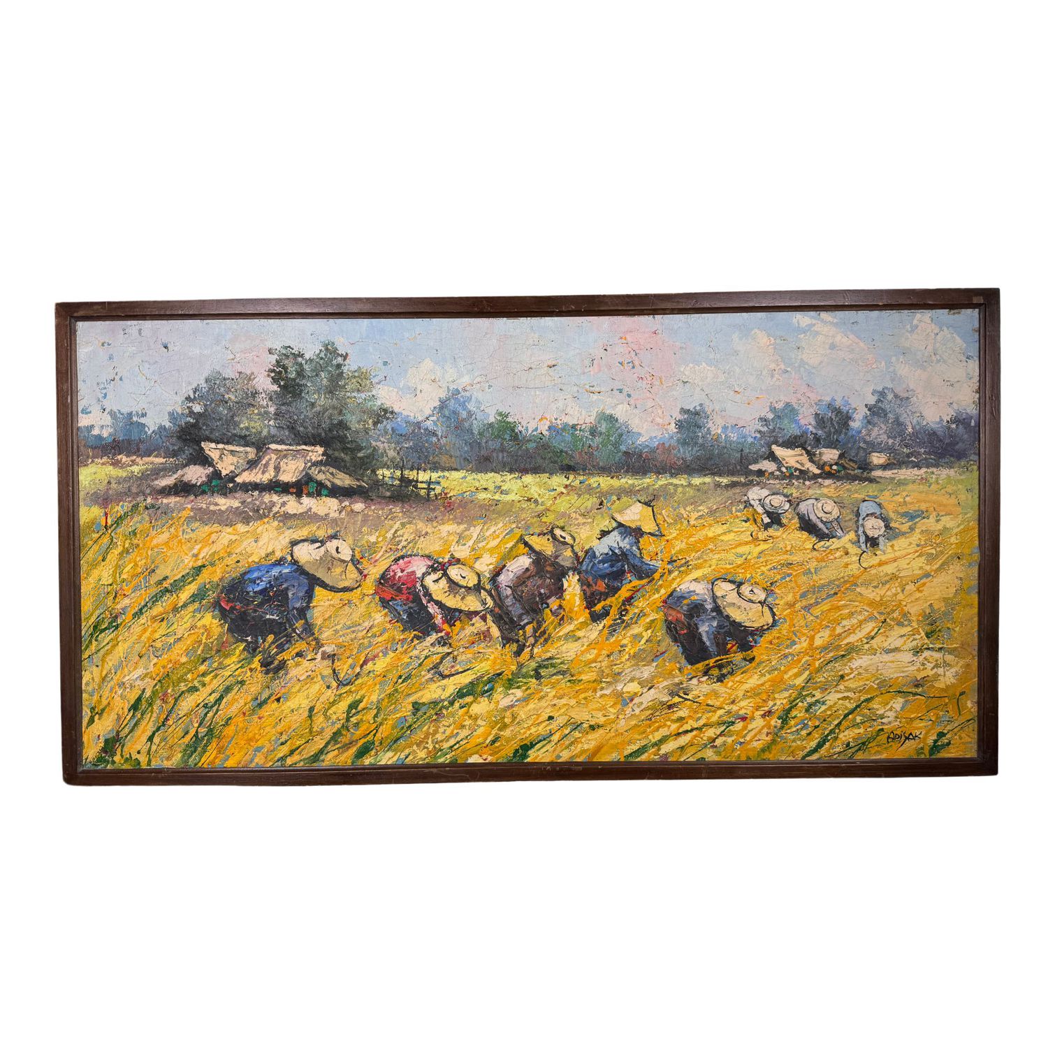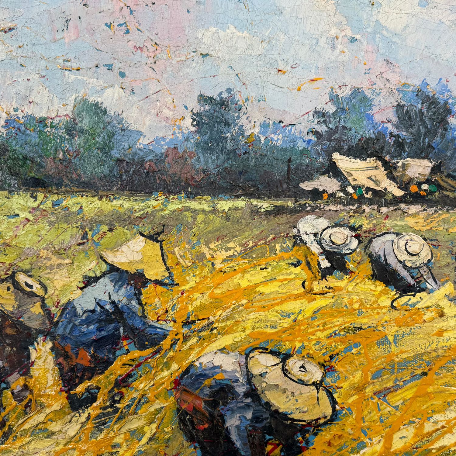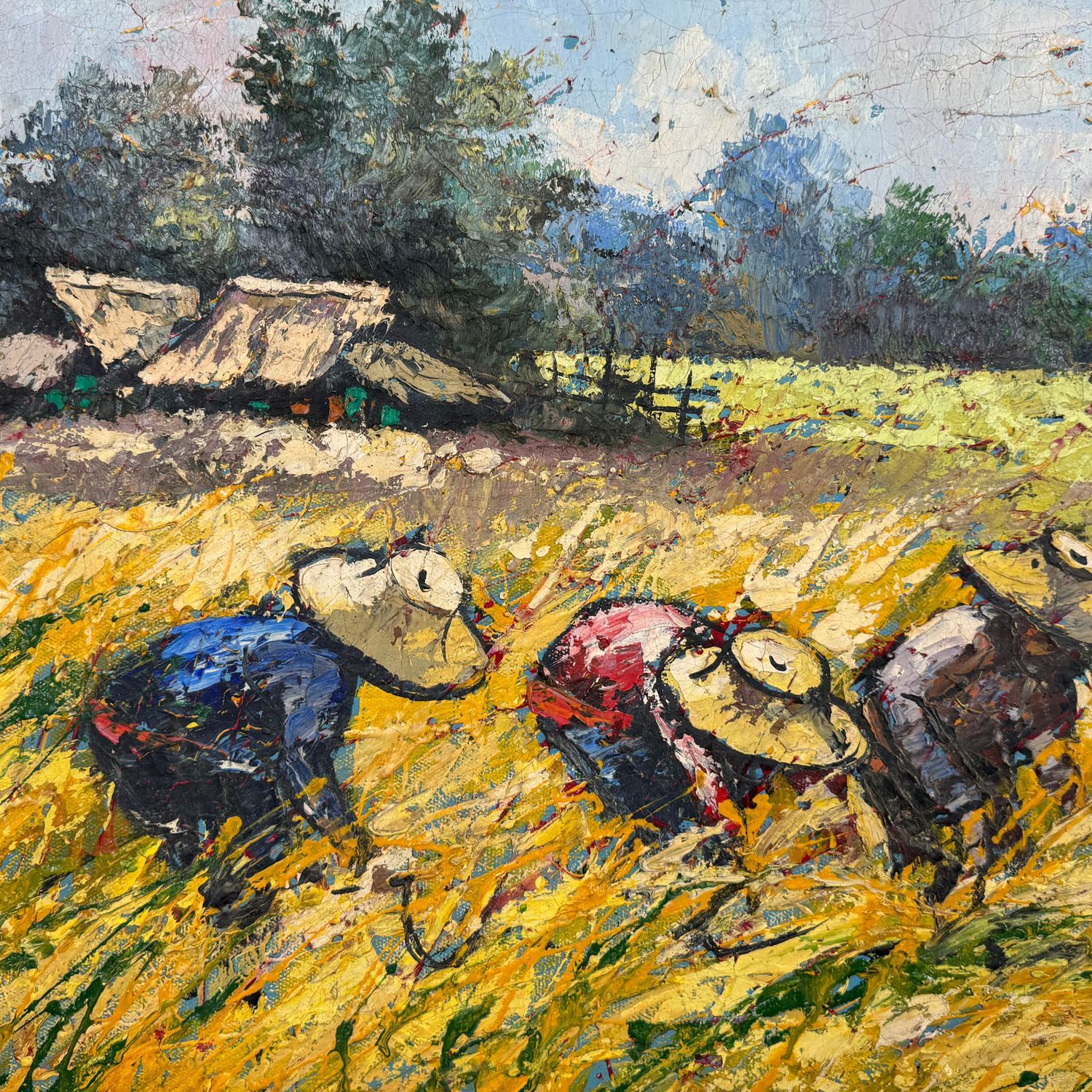Dipinto olio su pannello, periodo XX secolo scuola Continentale, raffigurante Mietitura del grano.