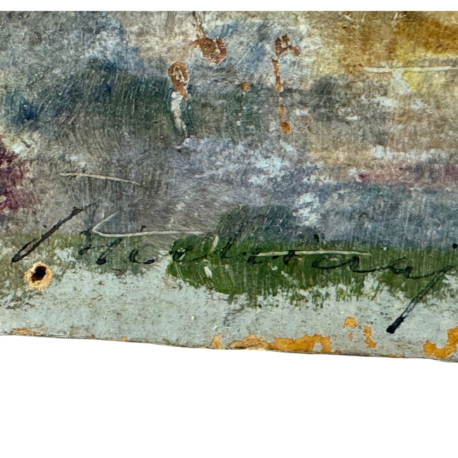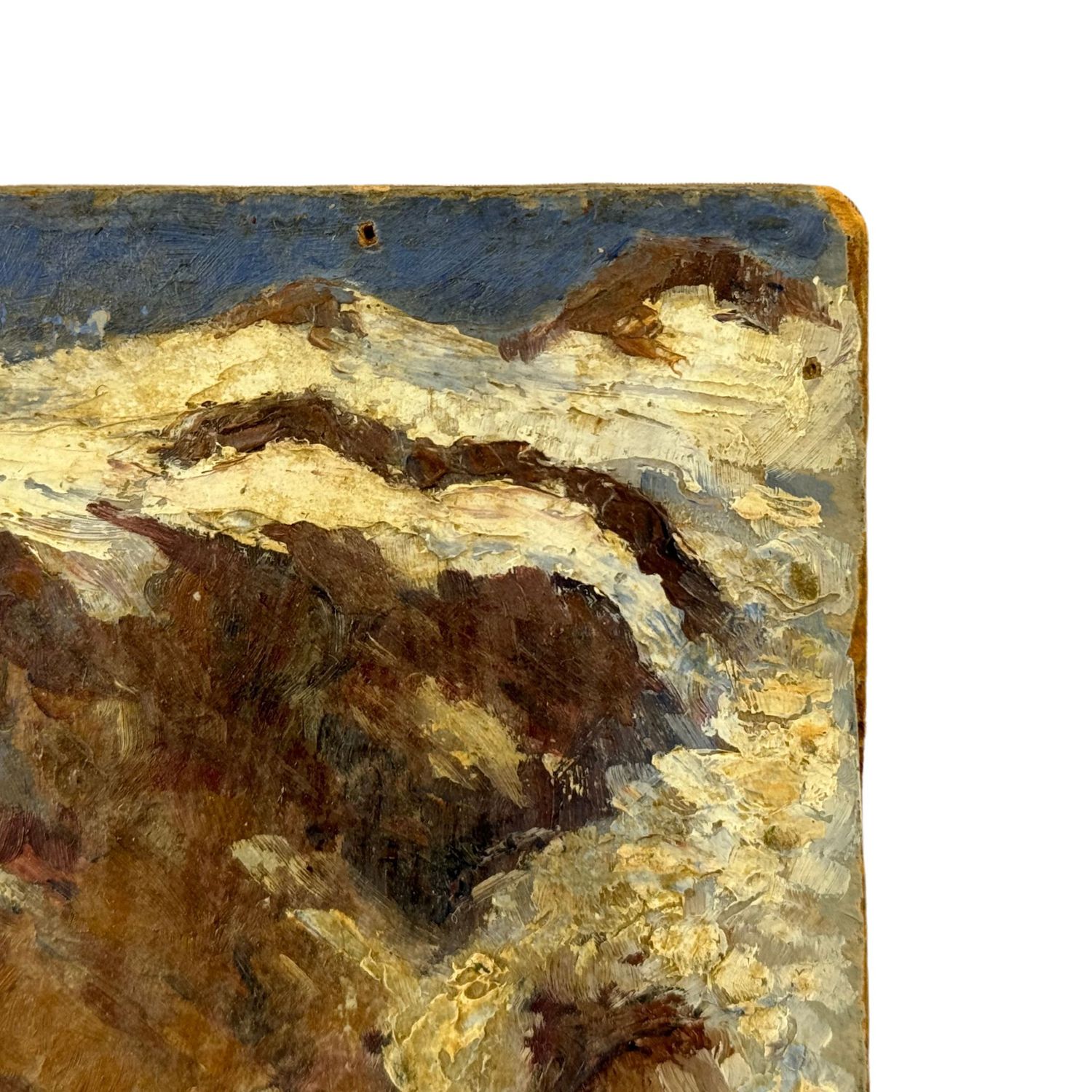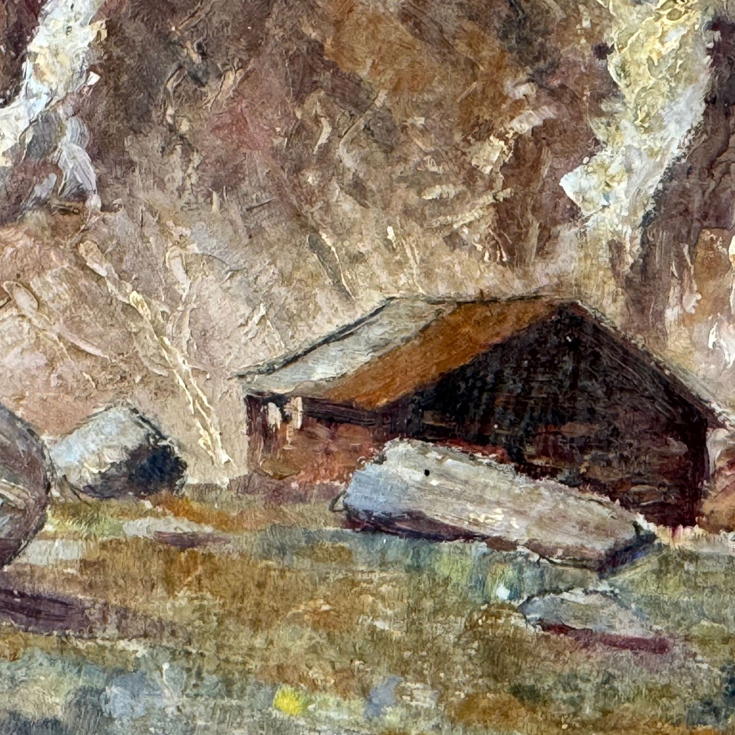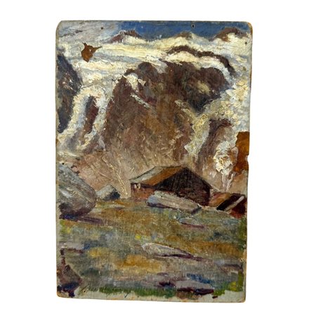 Piccolo dipinto olio su cartoncino, periodo XX secolo, scuola Italiana raffigurante Casolare sul Gran Paradiso