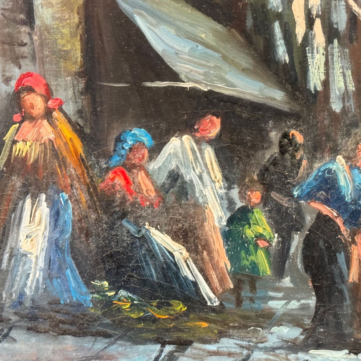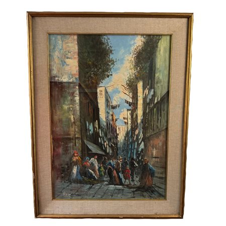 Dipinto olio su tela, periodo XX secolo scuola Italiana, raffigurante Strada con personaggi.