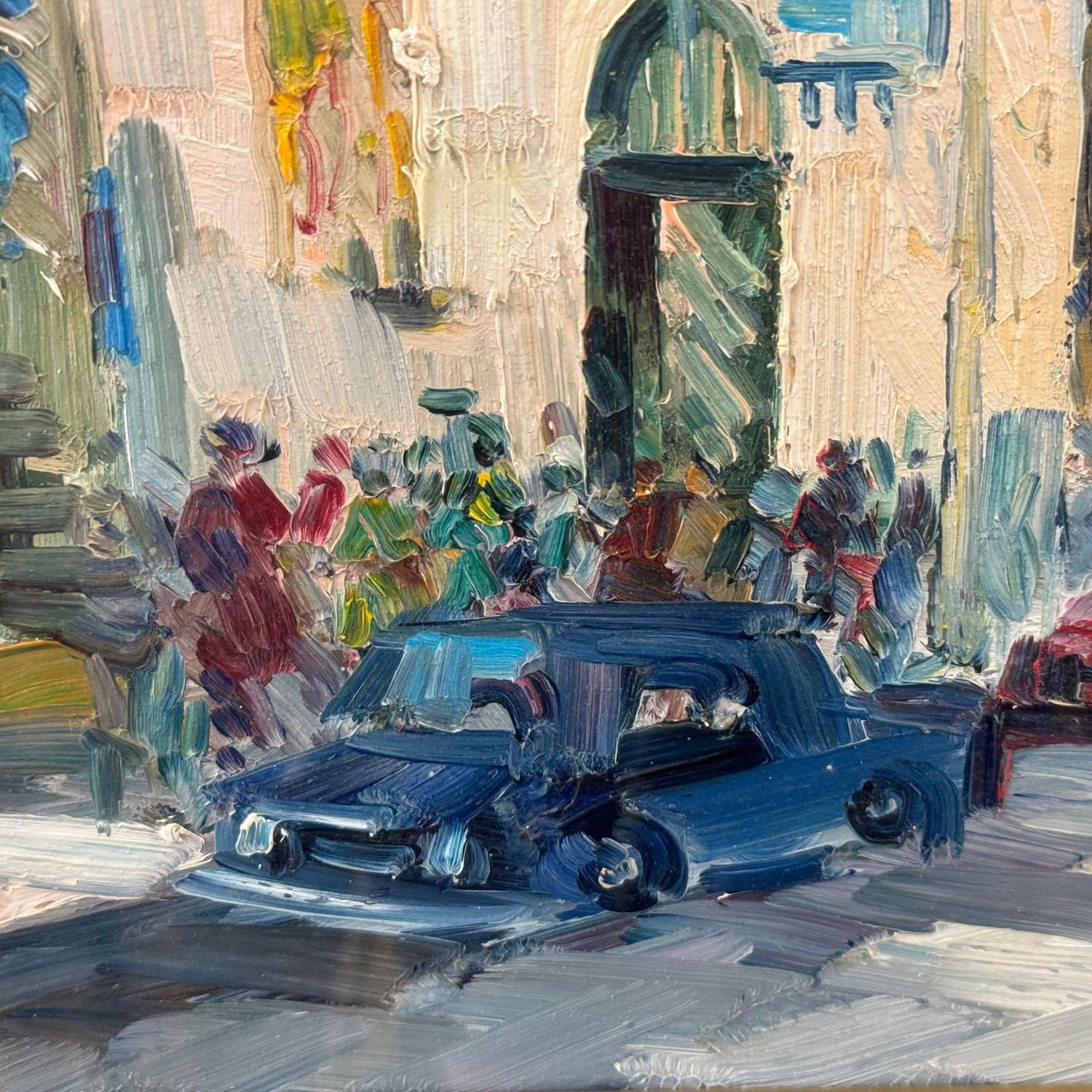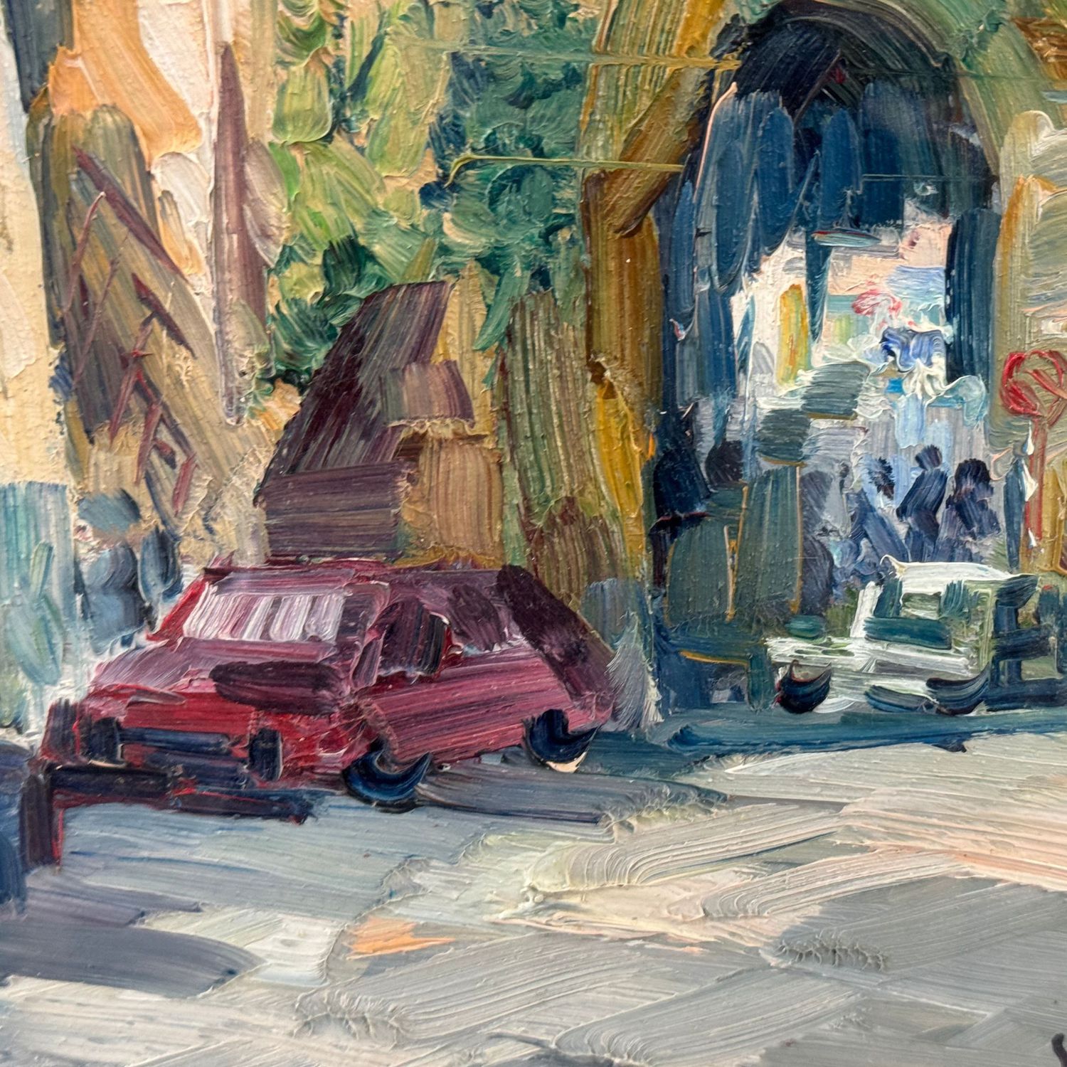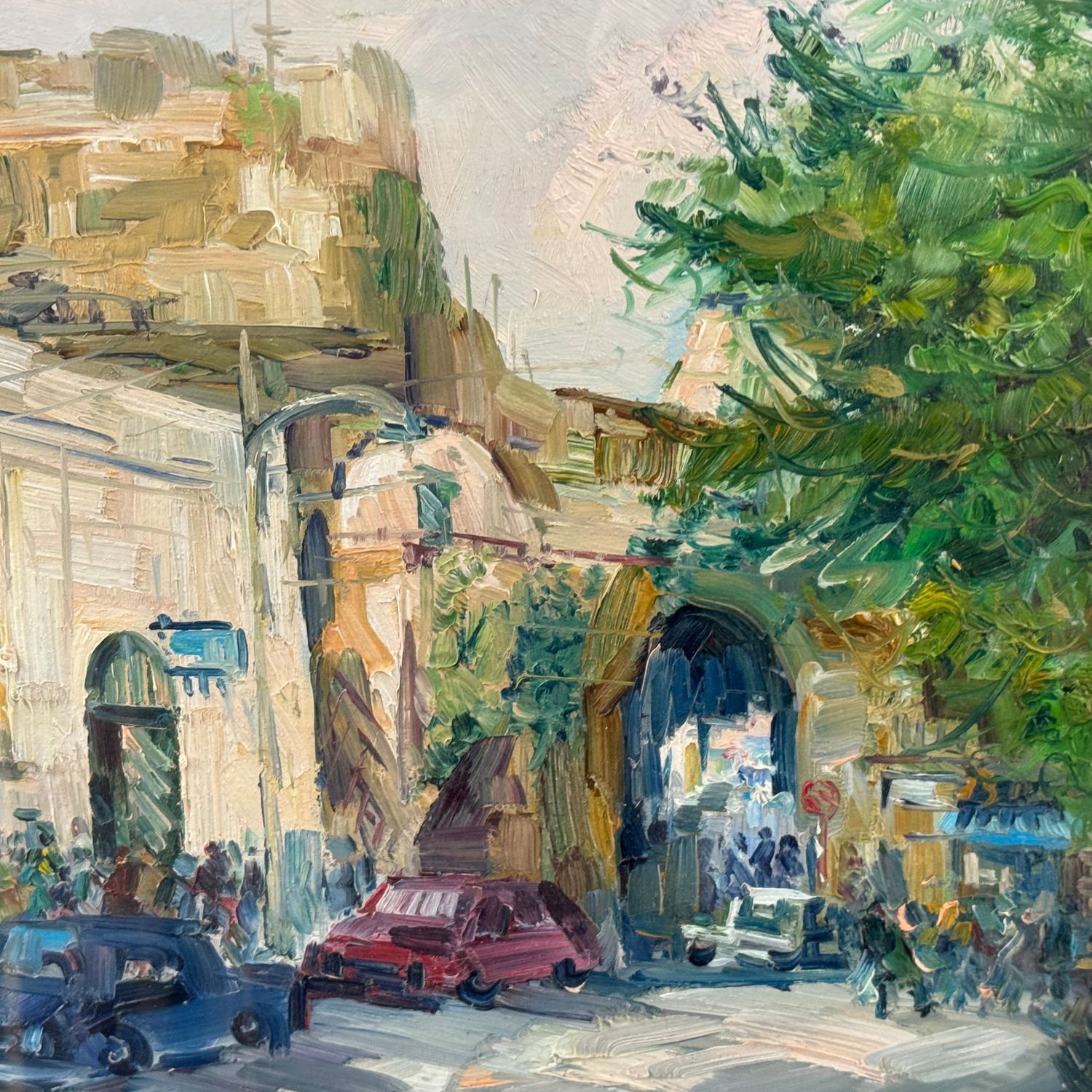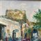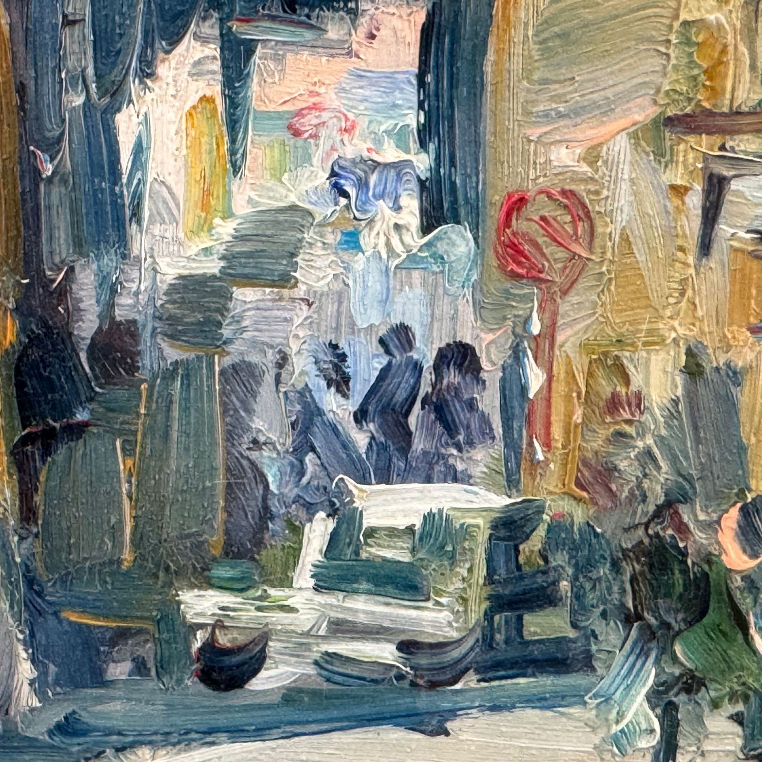 Dipinto olio su tavola, periodo XX secolo scuola Italiana, raffigurante Strada con personaggi.