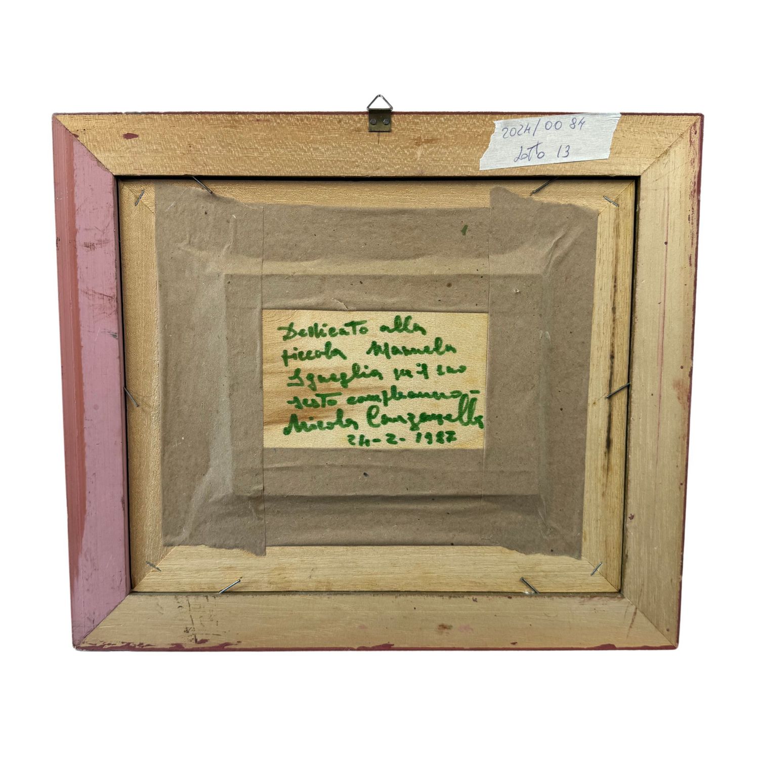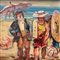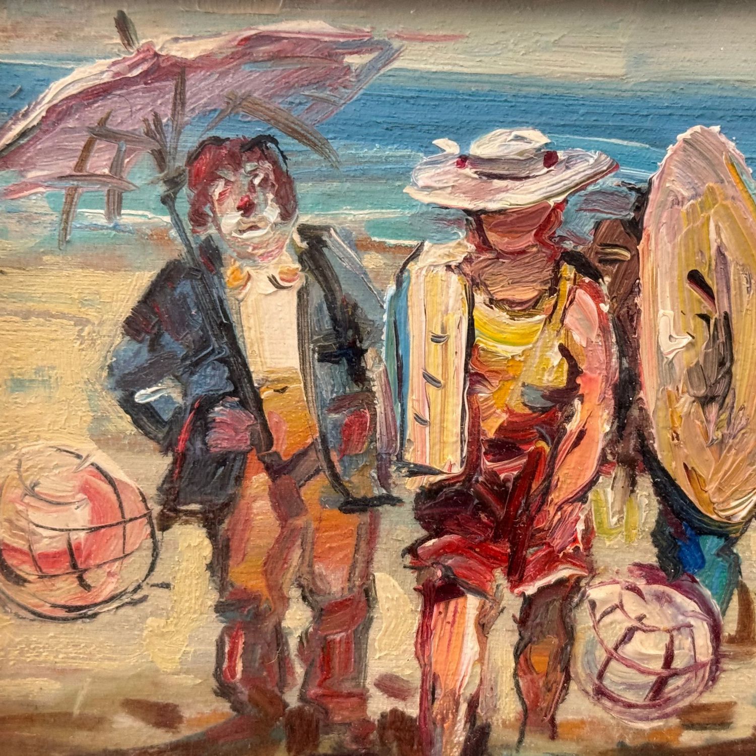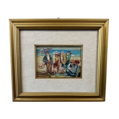 Dipinto olio su tavola, periodo XX secolo scuola Italiana, raffigurante Personaggi circensi su marina.