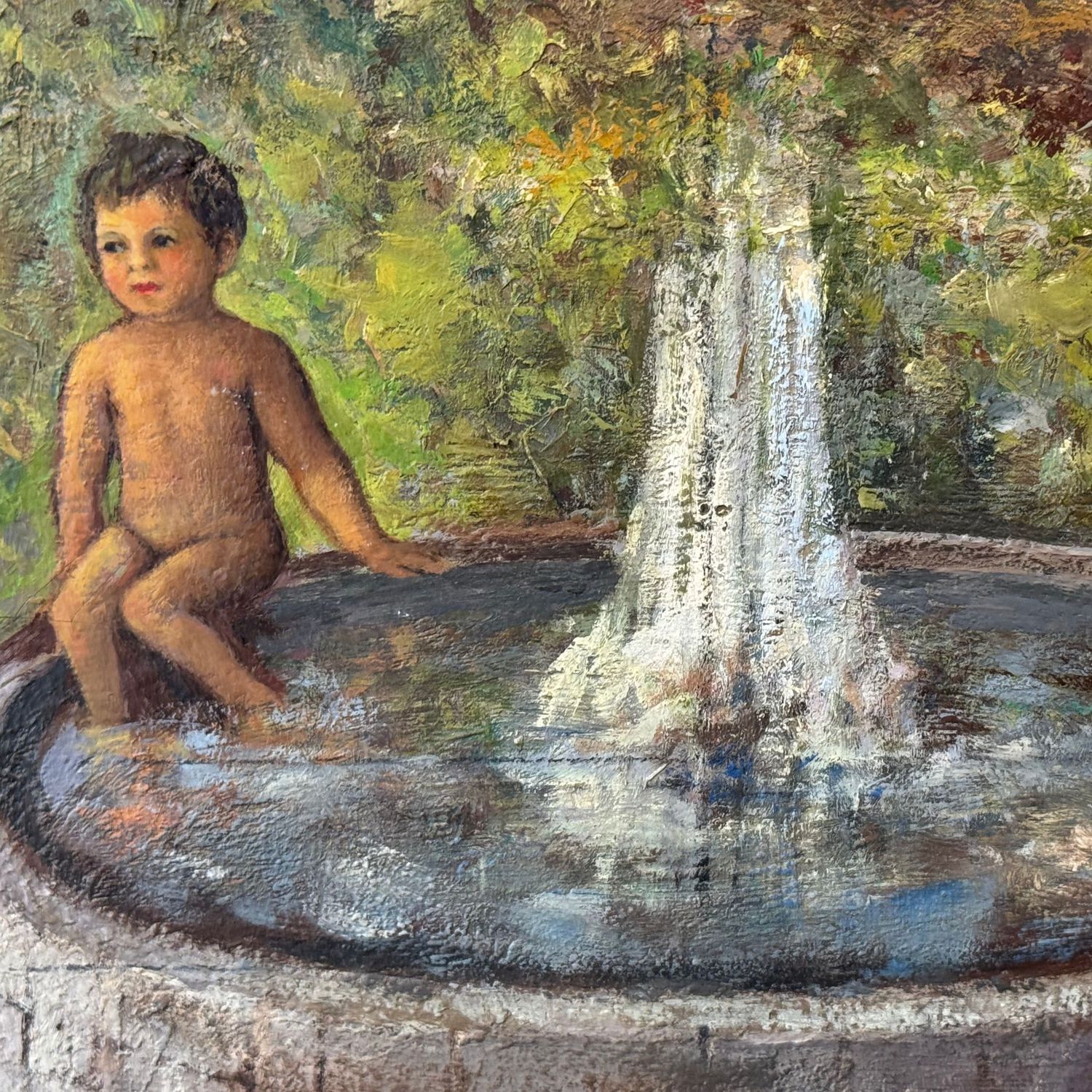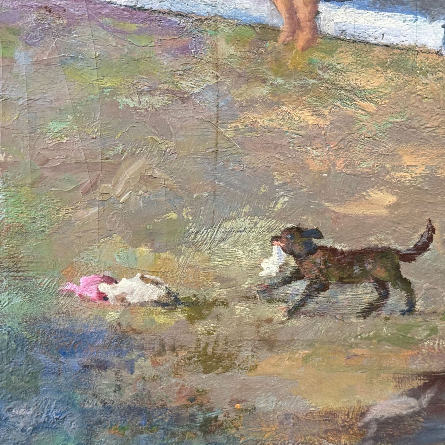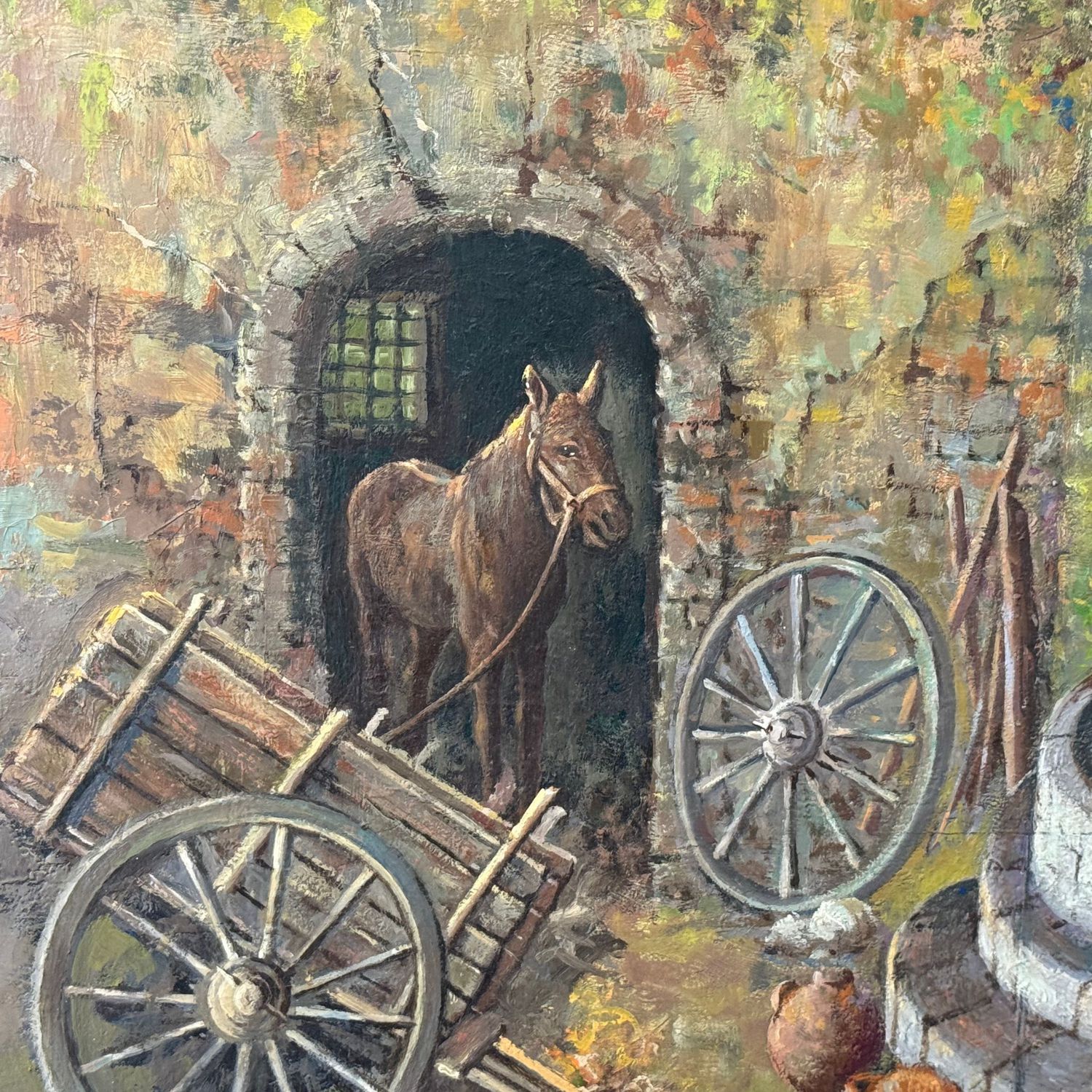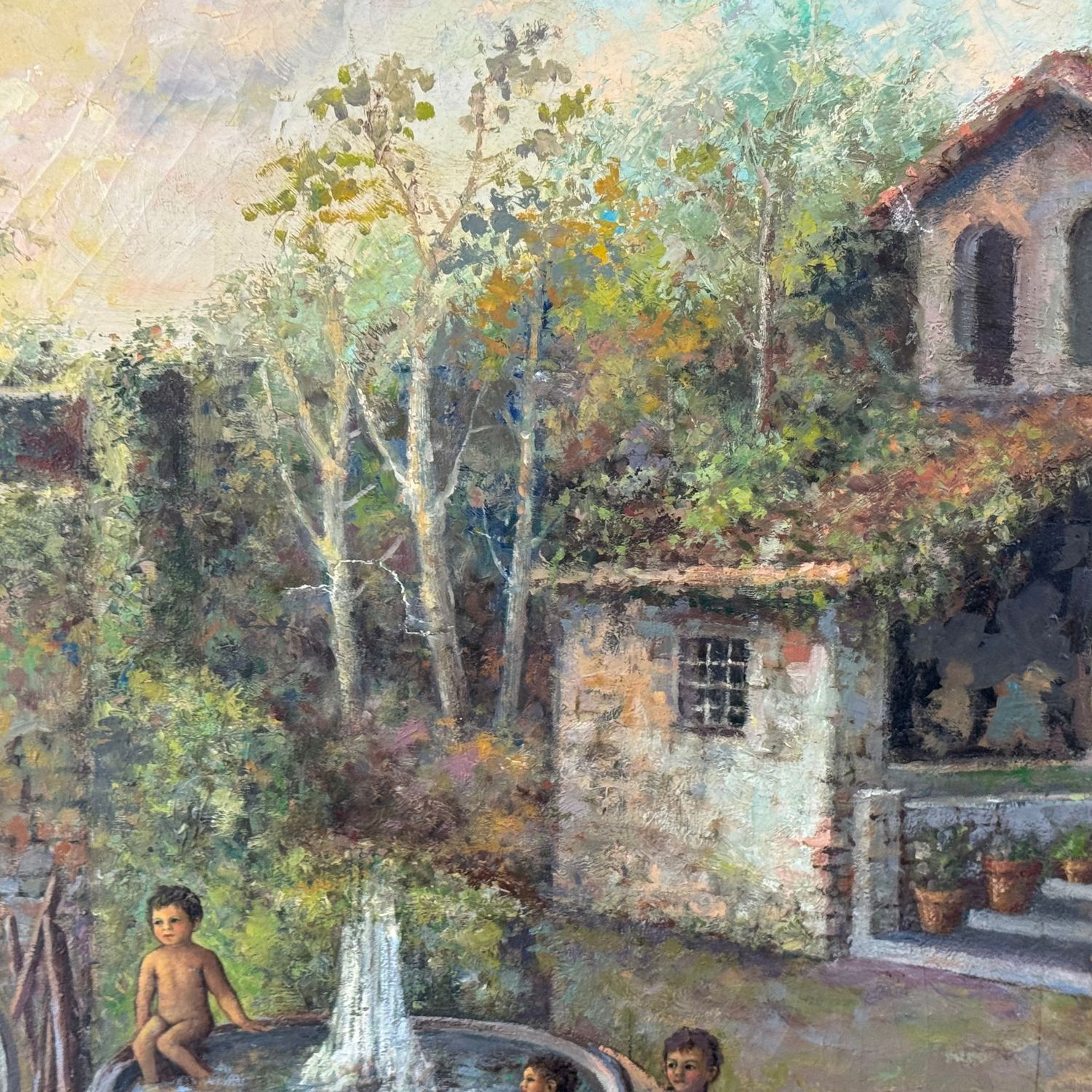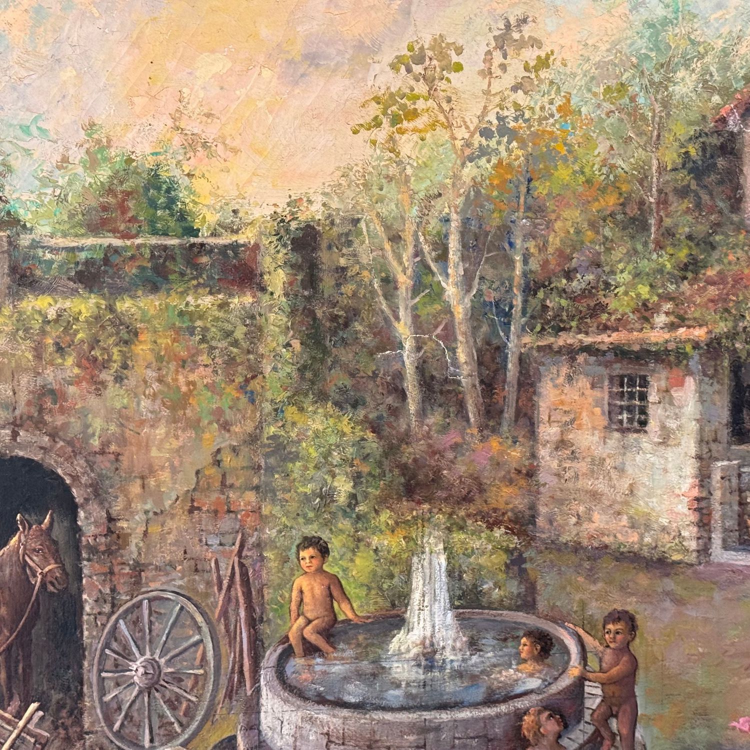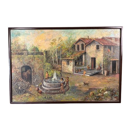 Dipinto olio su tela, periodo XX secolo scuola Italiana, raffigurante Giochi di bambini in fattoria.