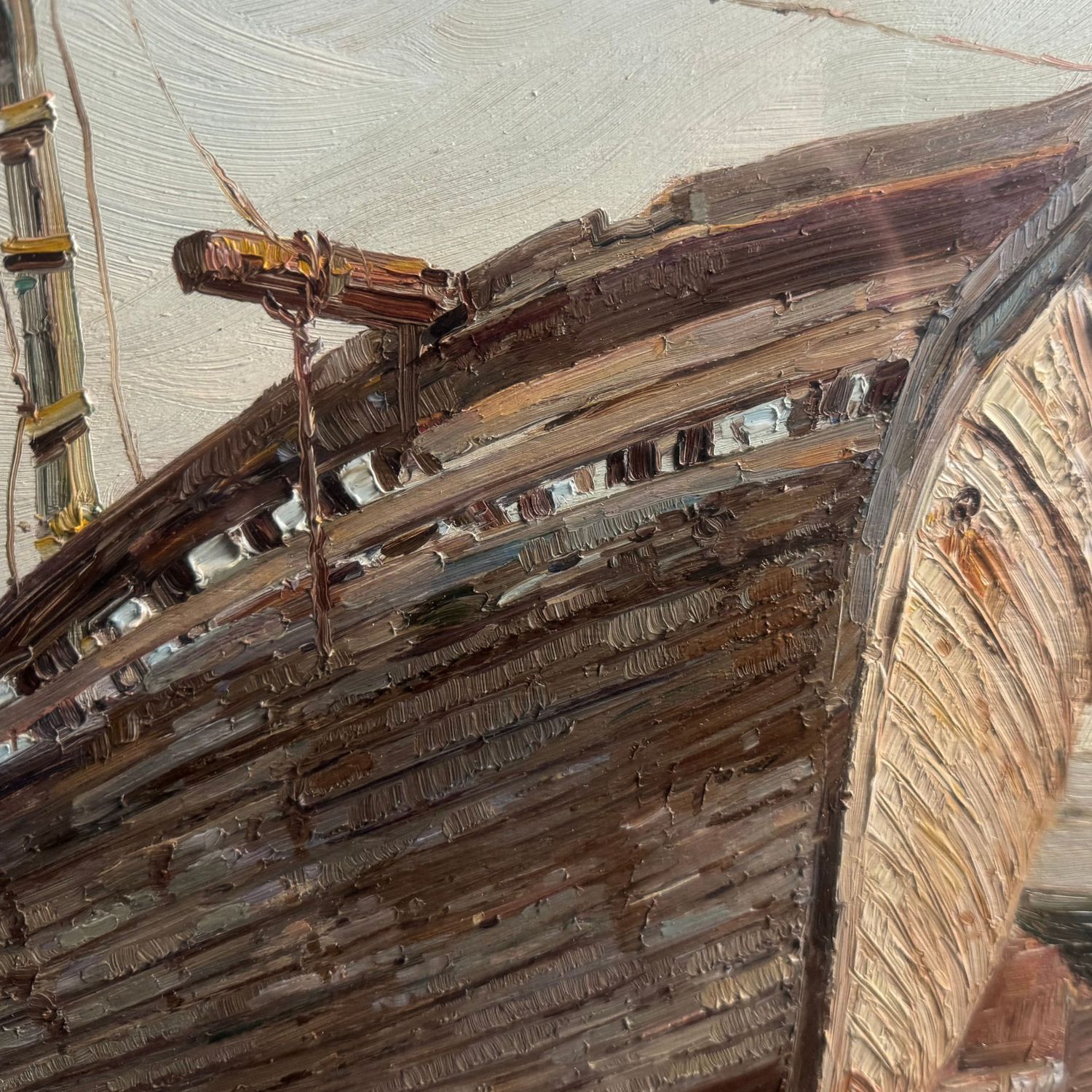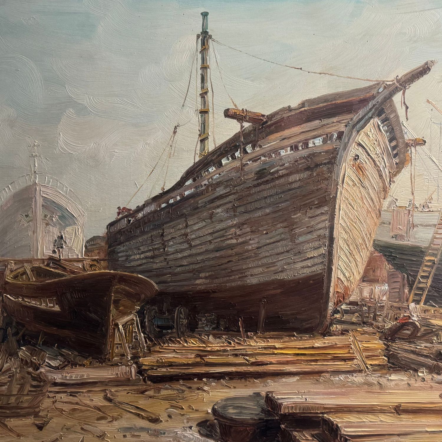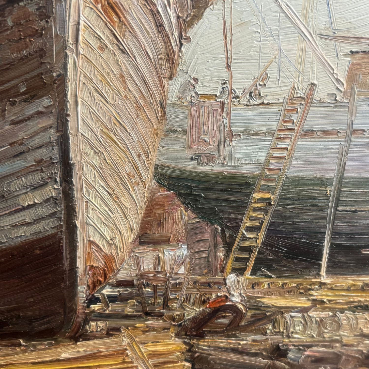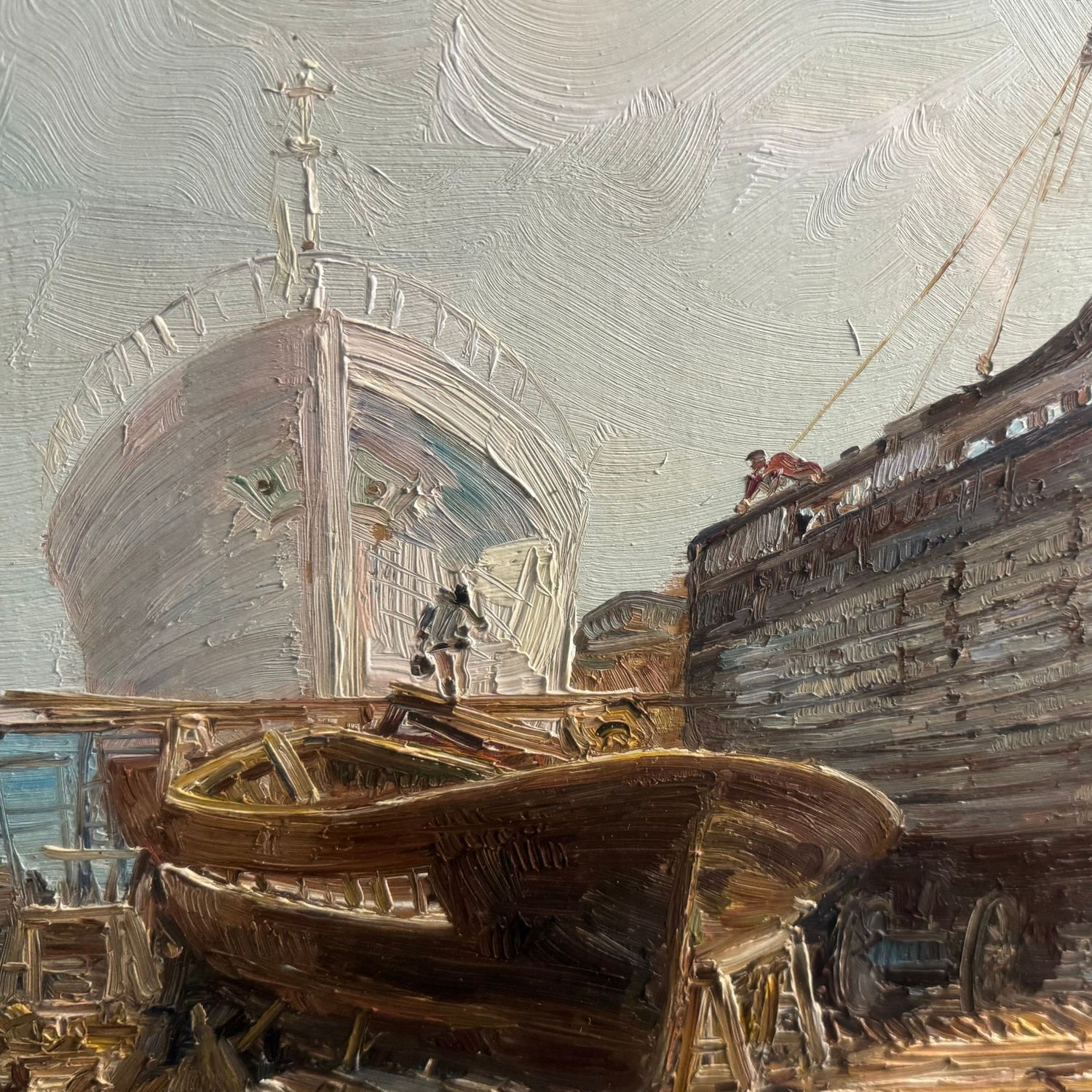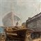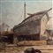 Dipinto olio su tavola, periodo XX secolo scuola Italiana, raffigurante Velieri in cantiere.