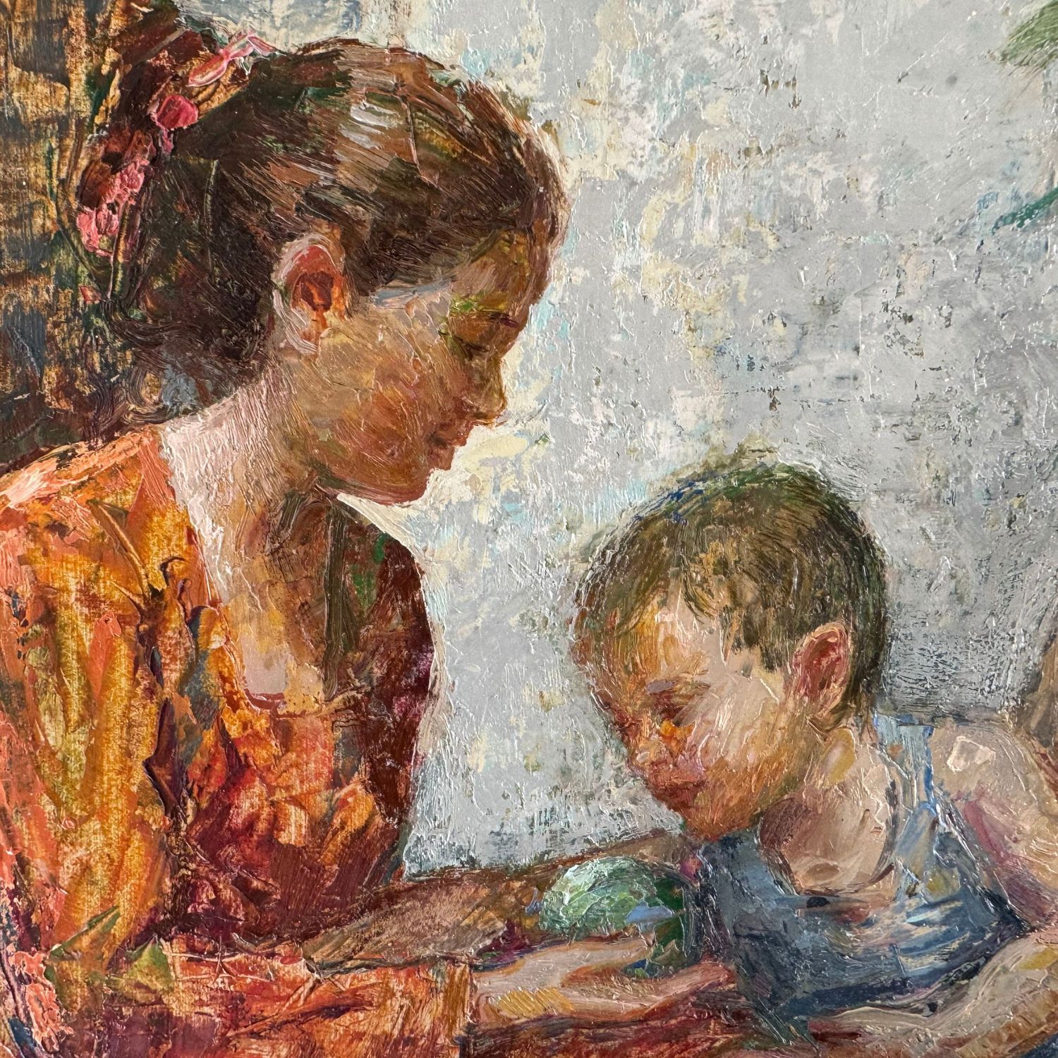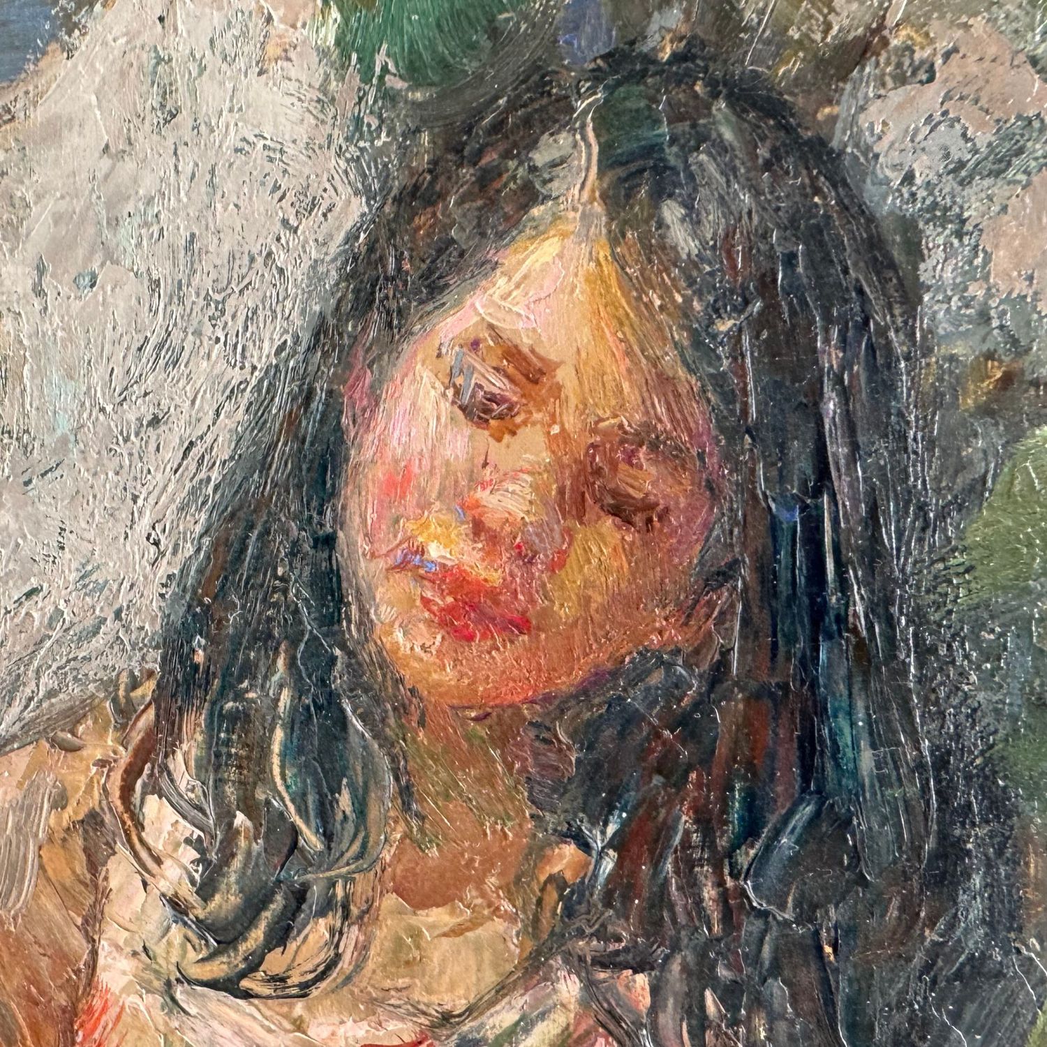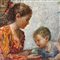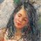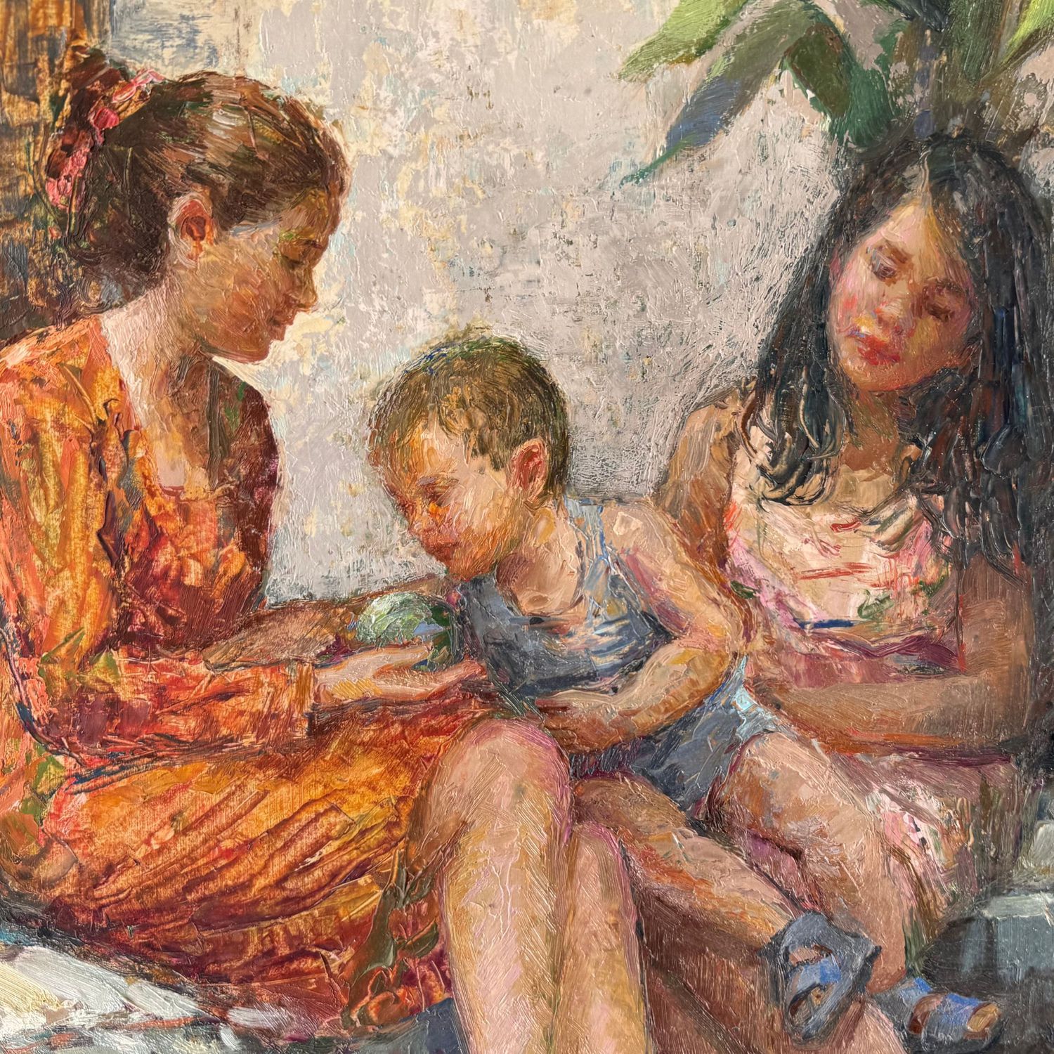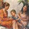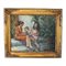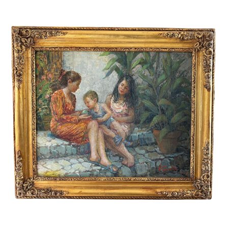Dipinto olio su pannello, periodo XX secolo scuola italiana, raffigurante Scena con tre personaggi in giardino.
