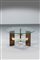 Struttura in legno, legno tinto e piano in vetro.