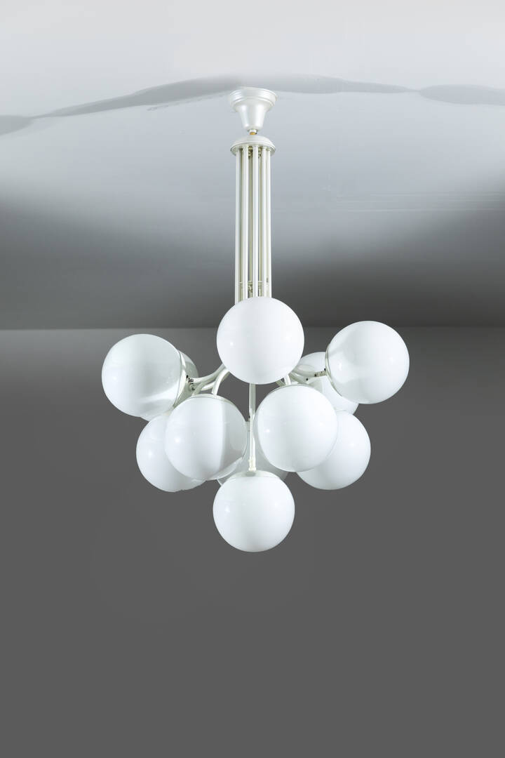 Struttura in metallo verniciato, diffusori in vetro opalino.