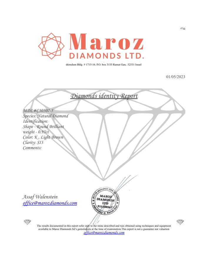 DIAMANTE 0,93 CARATI COLORE K - PUREZZA SI3 - TAGLIO BRILLANTE - CERTIFICATO GEMMOLOGICO MAROZ DIAMONDS LTD MEMBRO ISRAEL DIAMOND EXCHANGE - C30507-5