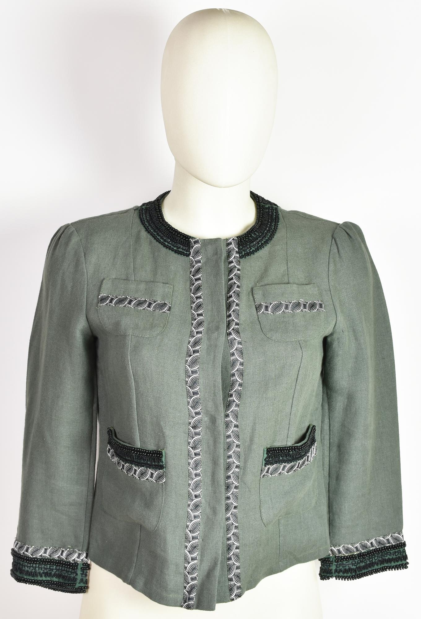 Giacca corta in lino con dettagli ricamati a mano. Bottoni a scomparsa. Taglia 40 IT. Prodotto in Italia. Perfettamente conservato.