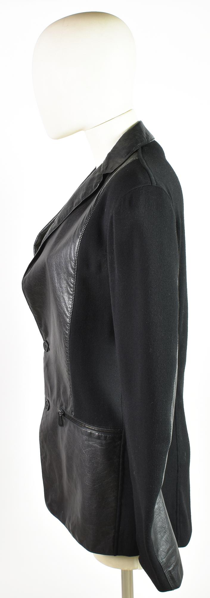 Giacca in pelle e cotone elasticizzato. Tasche con chiusura a cerniera. Capo di campionario FW 2012-2013. Taglia 48 IT. Prodotto in Italia. Perfettamente conservata.