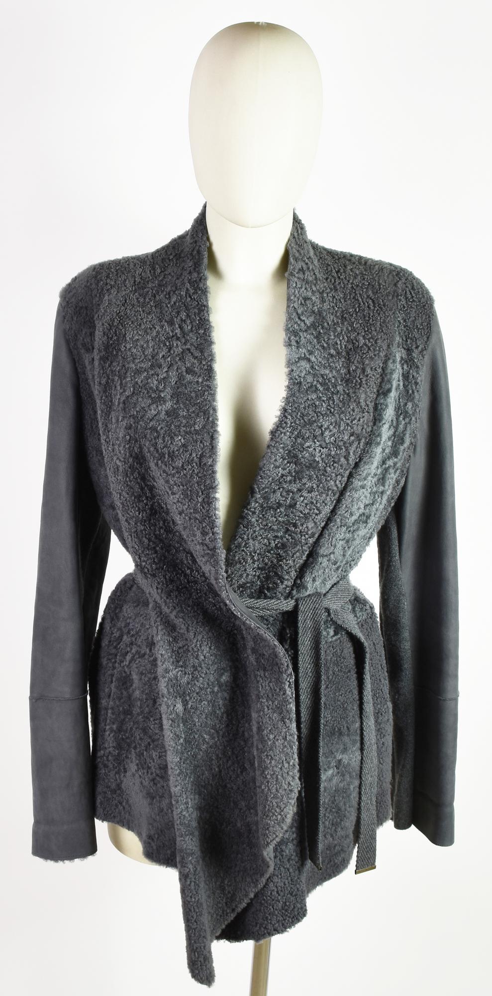 Giacca in pelle e pelliccia con dettagli in kashmir sulle maniche. Taglio a vivo e cintura in cashmere. Anni 2000. Taglia 48 IT. Prodotto in Italia. Perfettamente conservata.
