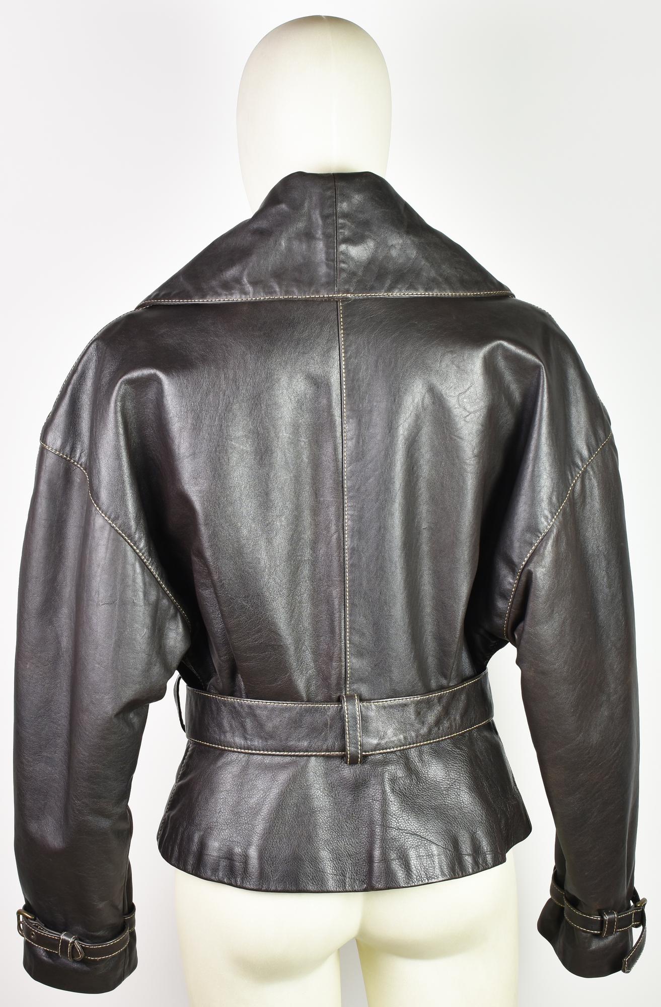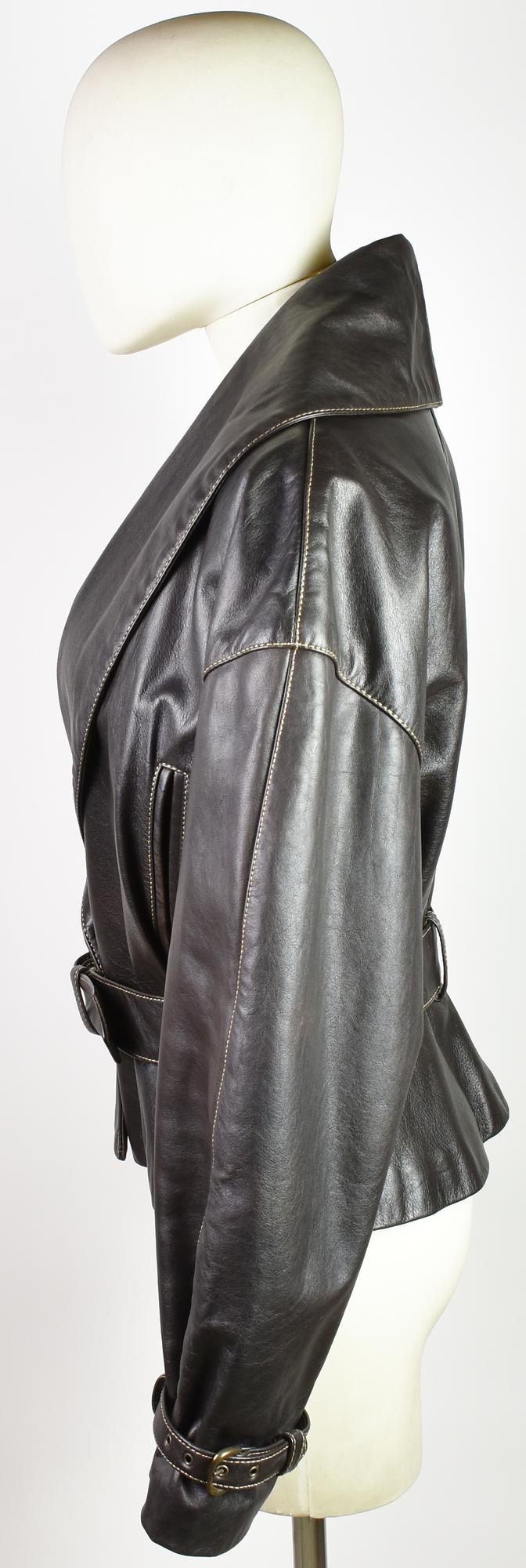 Dark brown leather jacket with contrast stitching. Features a waist belt, decorative straps on the cuffs, and two flap pockets. Quilted viscose lining. Size 46. Made in Italy. Perfectly preserved.