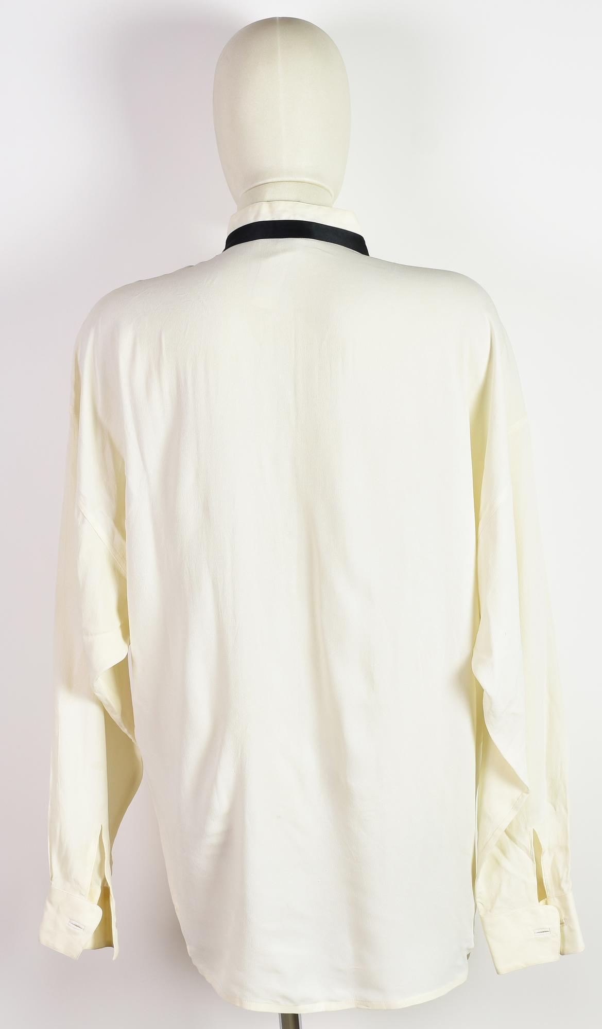 Camicia da uomo in seta e acetato bianca con collo alla coreana. Bottoni gioiello con il logo della Maison con alcune mancanze. Anni '90. Taglia 48. Prodotto in Italia. Il tessuto presenta macchie e segni del tempo. Discretamente conservata.