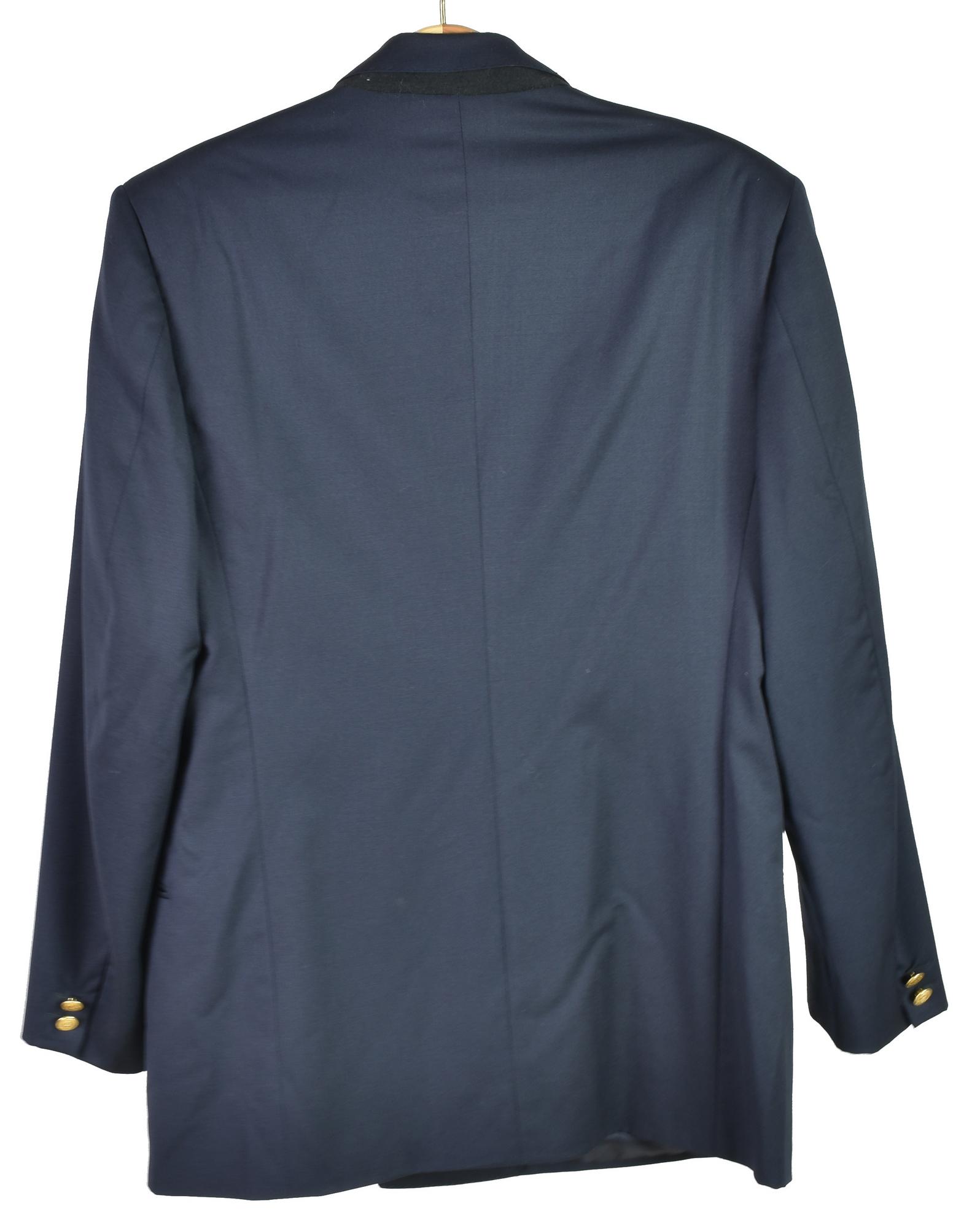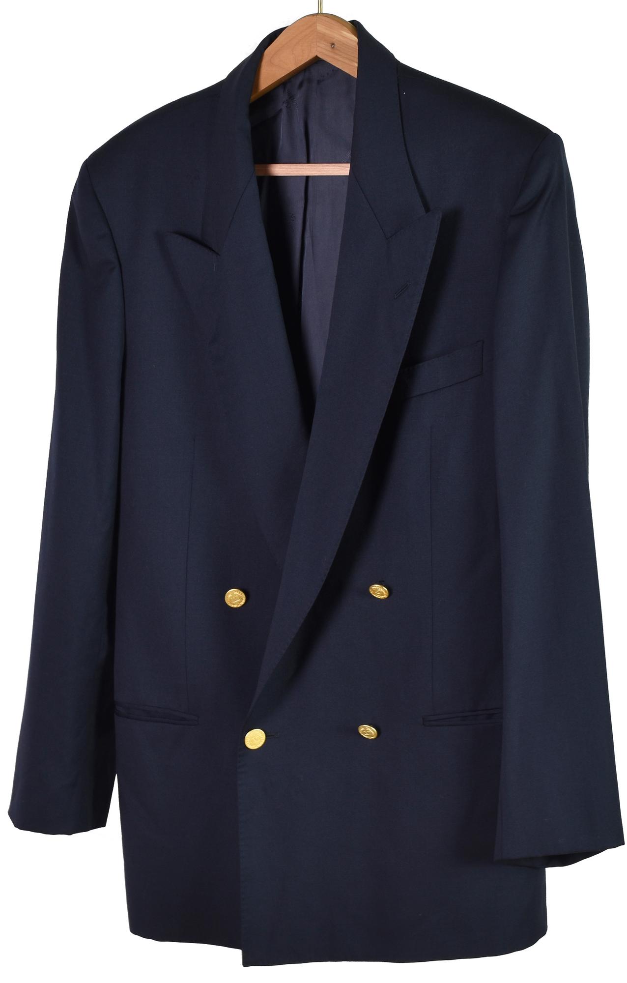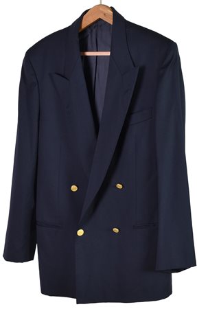Blazer doppiopetto da uomo blu scuro. Presenta due tasche esterne, un taschino esterno e due taschini interni. Spalline imbottite e bottoni dorati con il logo della Maison. Fodera interna logata. 100% lana. Taglia 50. Prodotto in Italia. Perfettamente conservato.