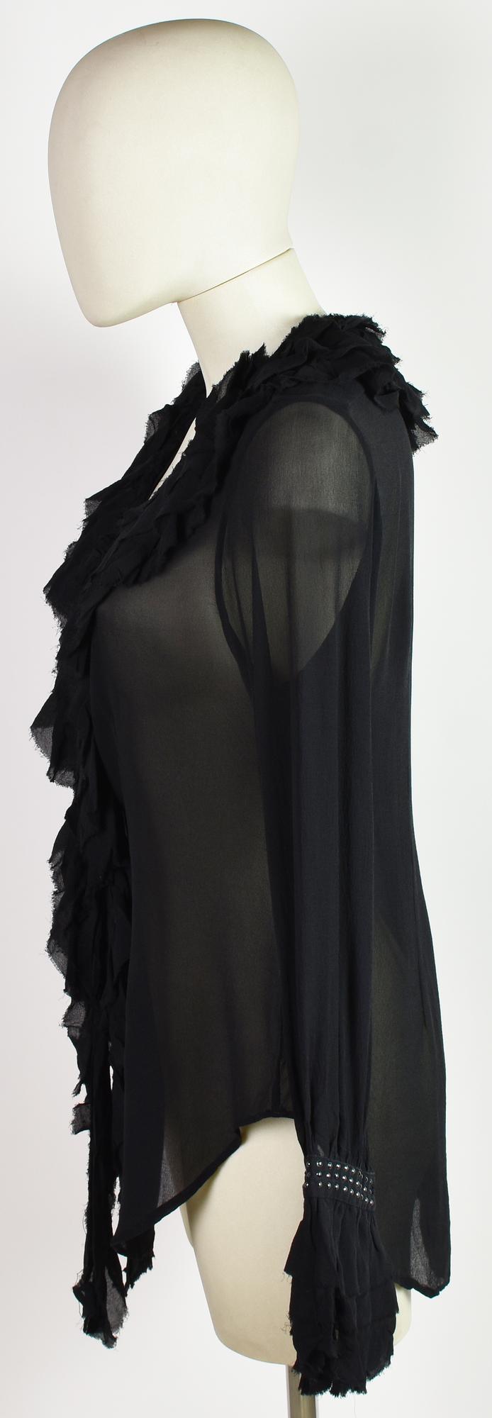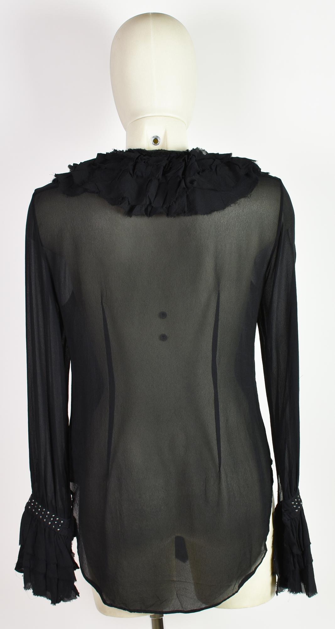 Black silk shirt with ruffle detail on the sleeves. Size 42 IT. 100% silk. Made in Italy. Perfectly preserved.
