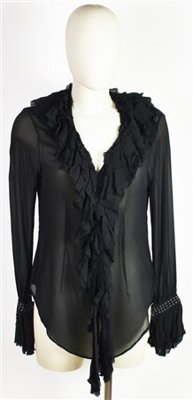 Camicia in seta nera con decoro a rouches ripreso sulle maniche. Taglia 42 IT. 100% seta. Prodotta in Italia. Perfettamente conservata.